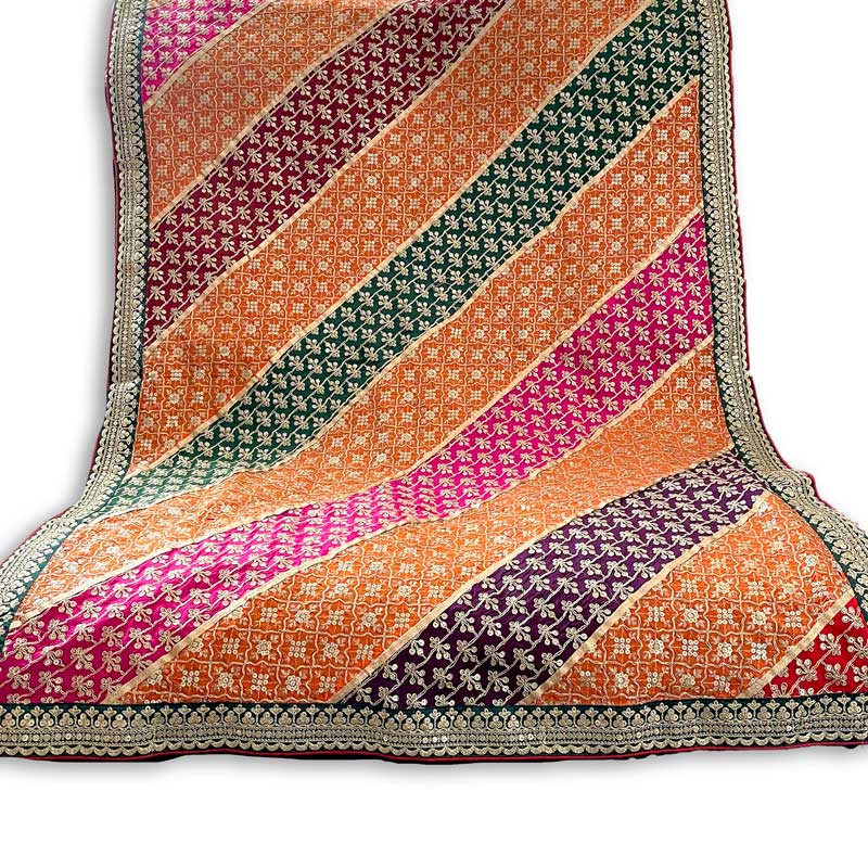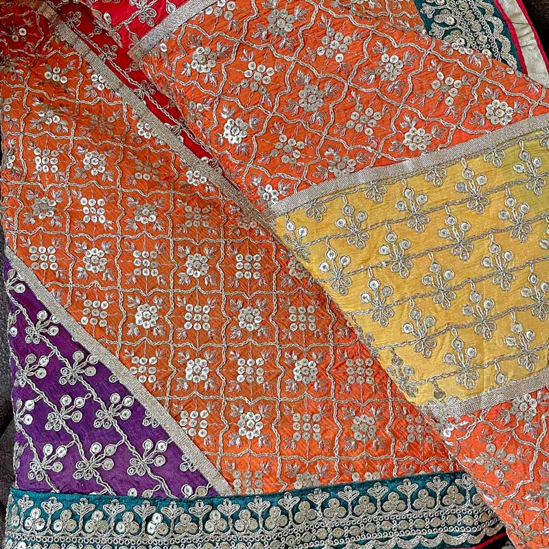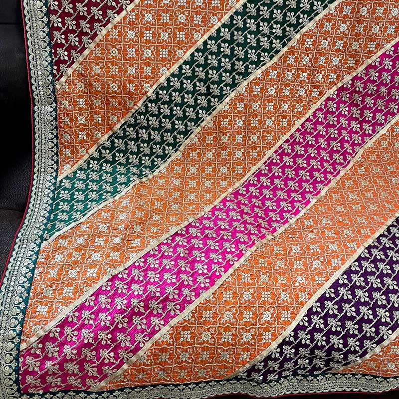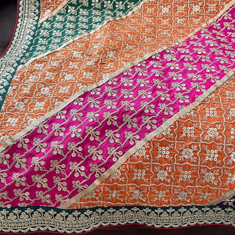 Latest trend stunning embroidery & sequin work all over chinon chiffon dupatta. Beautiful embroidery design & vibrant color full size dupatta. Length 2.5 meter, Width 40" in chinon silk material. Multicolored dupatta is ready to ship from California.