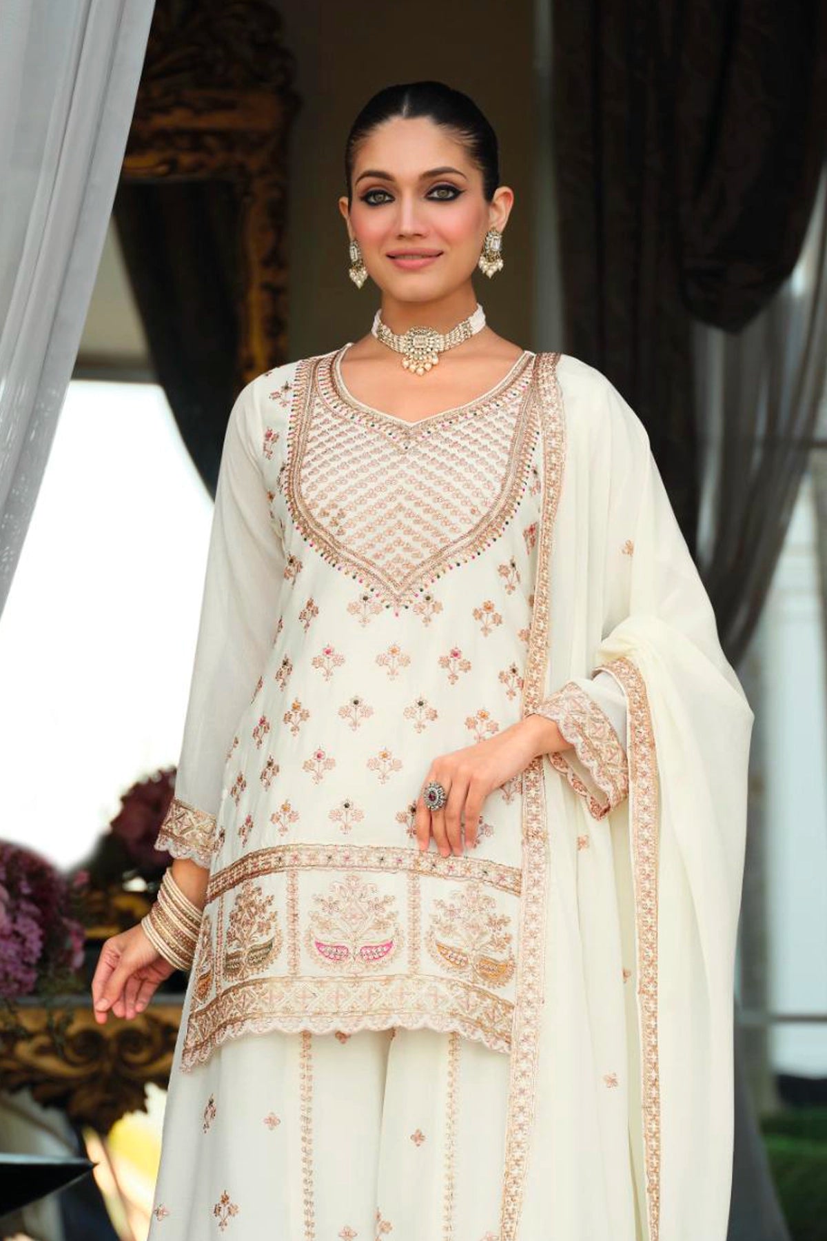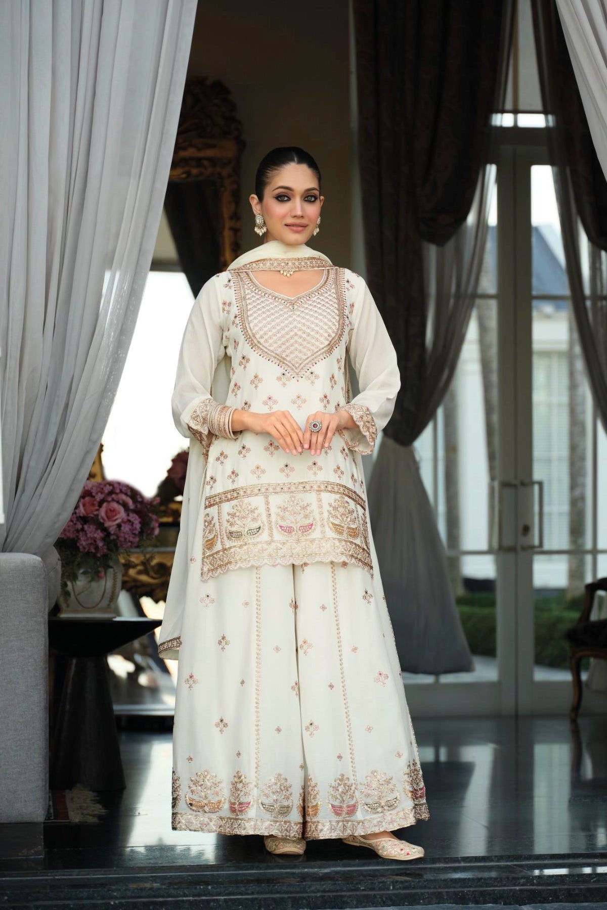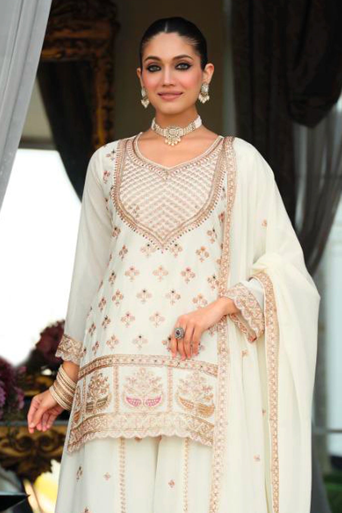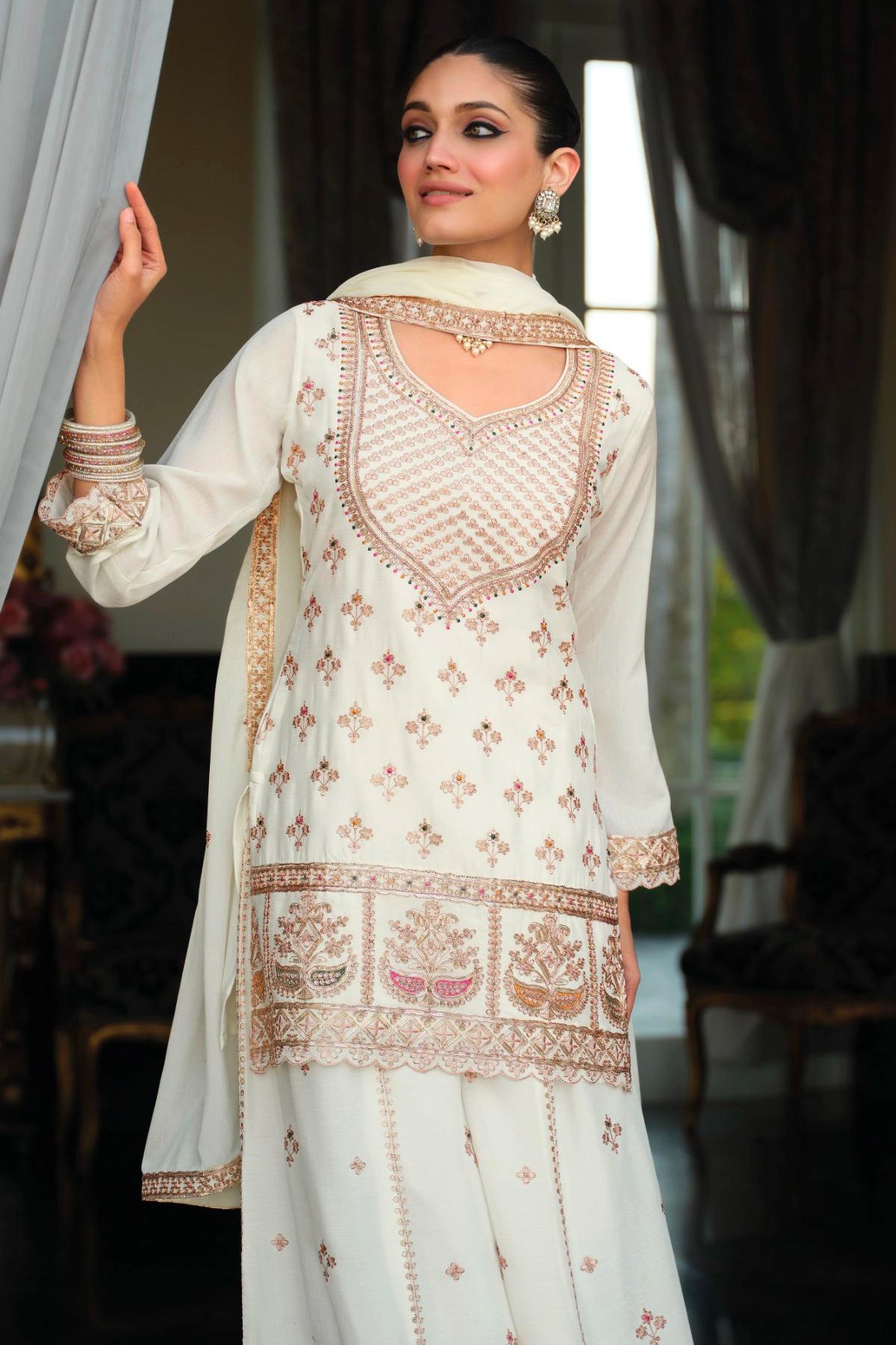 Turn heads at your next celebration with this stunning Ivory Chinon Sharara Suit Set, crafted to make a statement at weddings, festive gatherings, and special occasions.