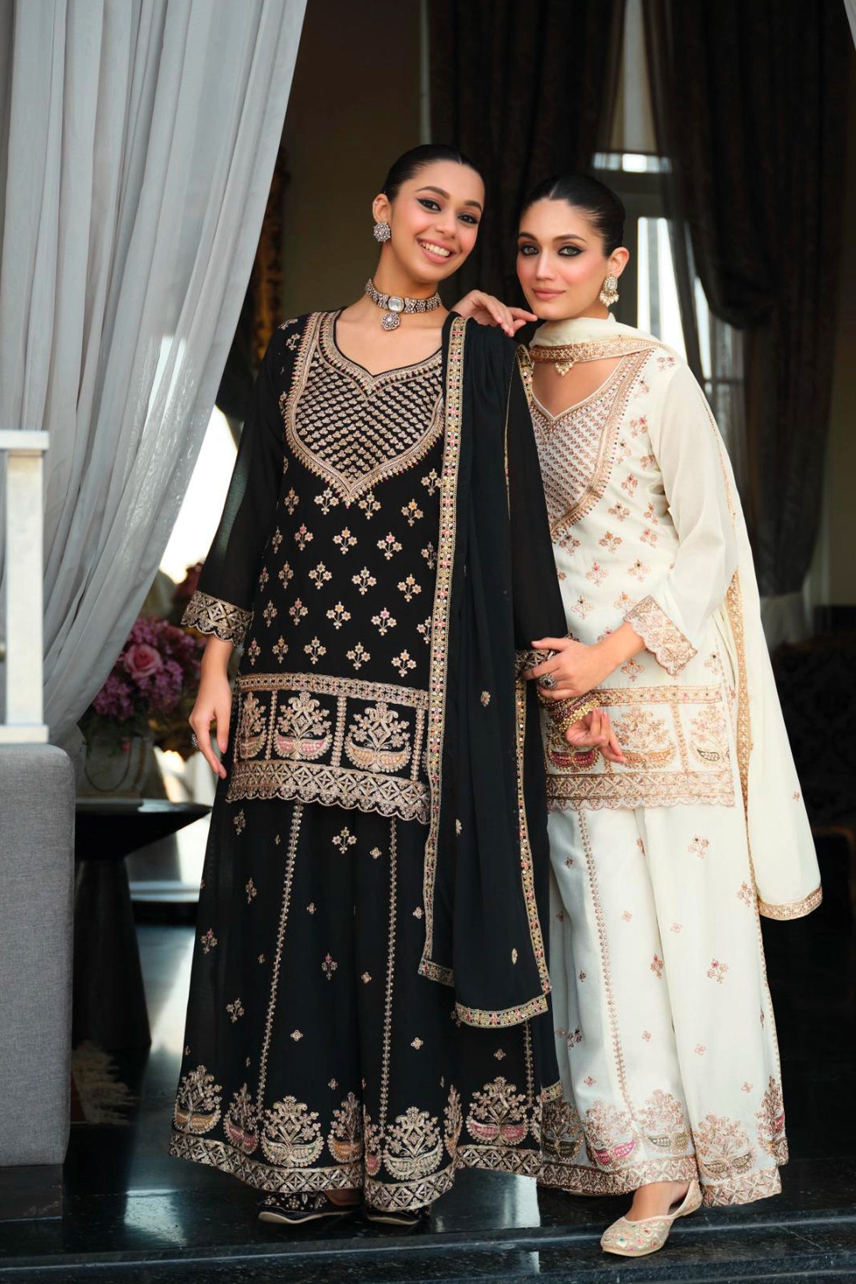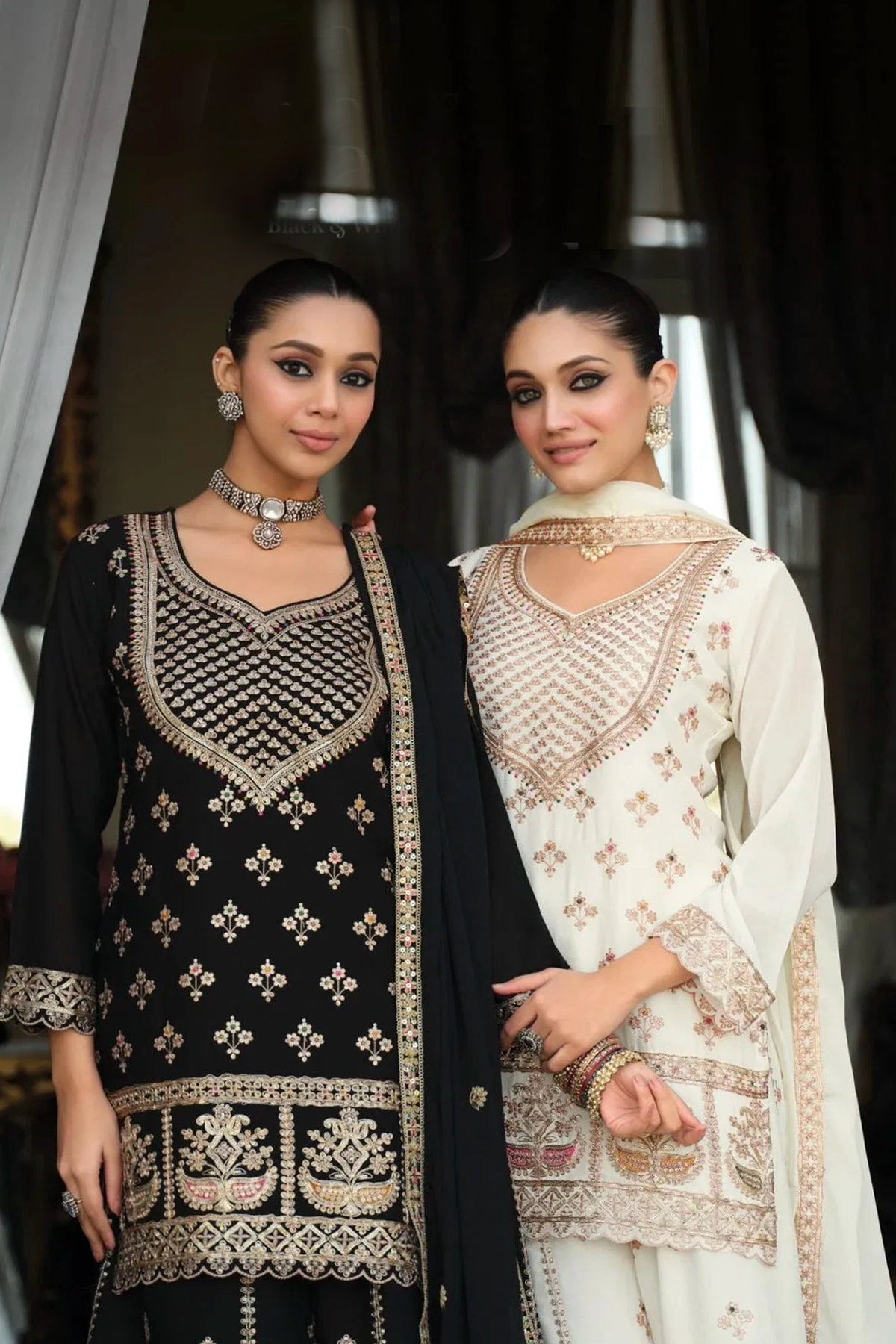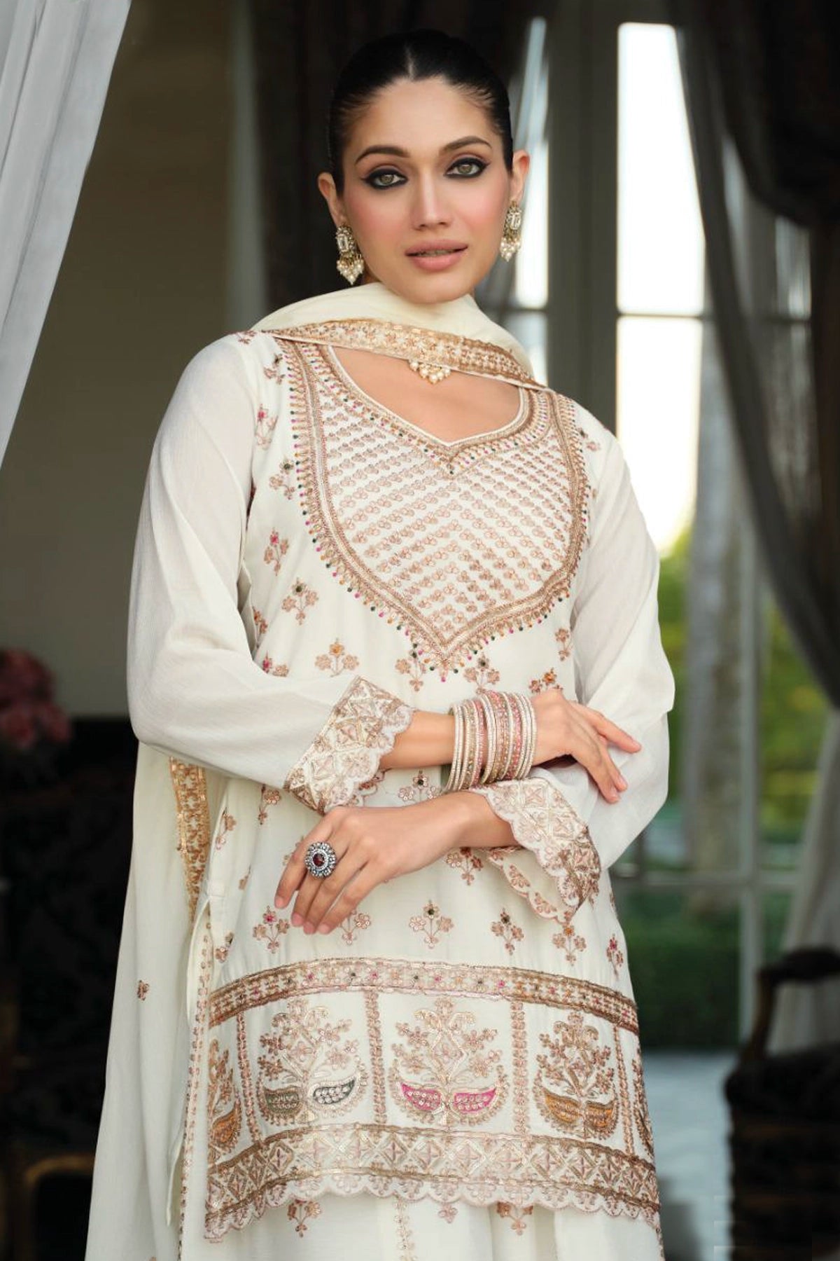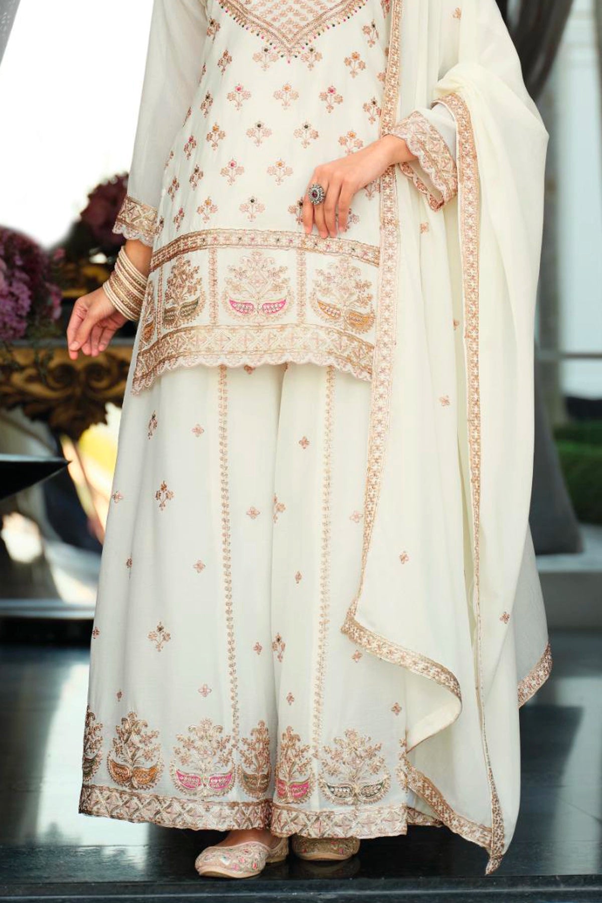 Turn heads at your next celebration with this stunning Ivory Chinon Sharara Suit Set, crafted to make a statement at weddings, festive gatherings, and special occasions.