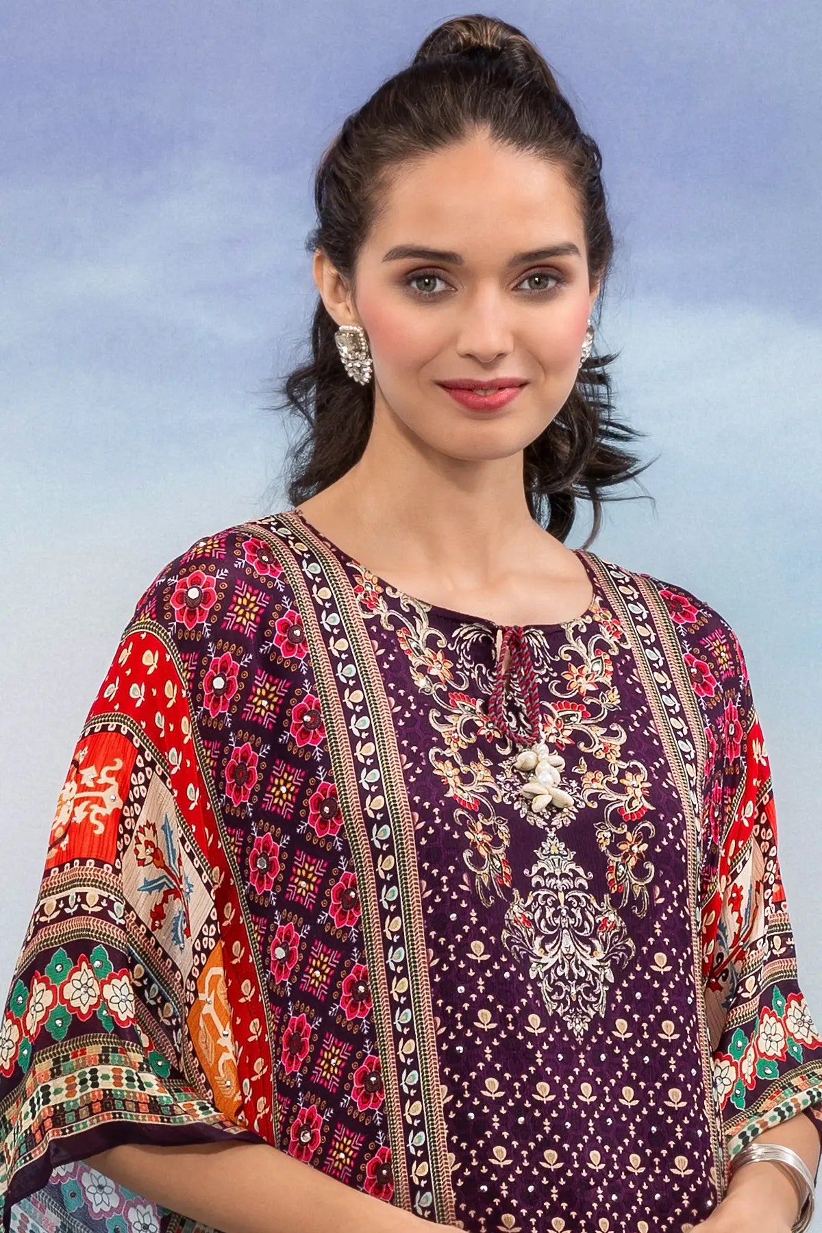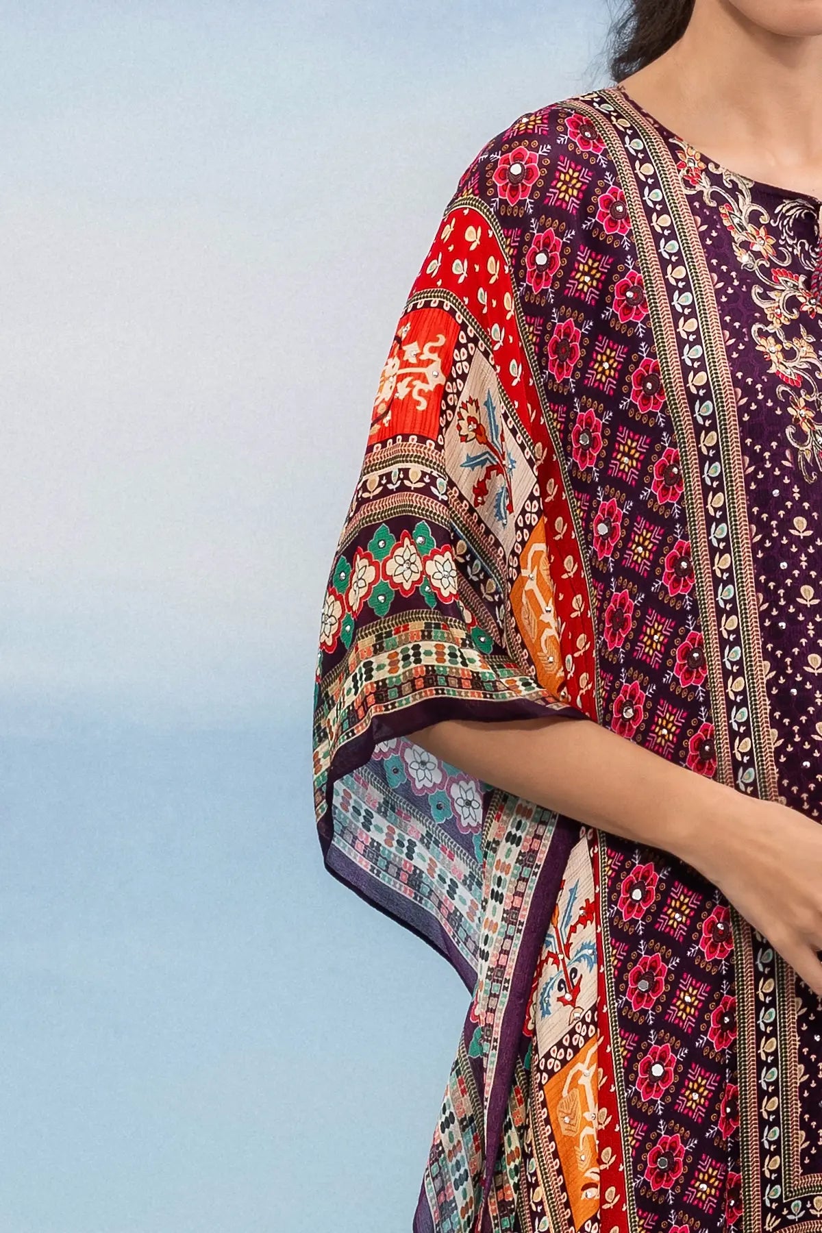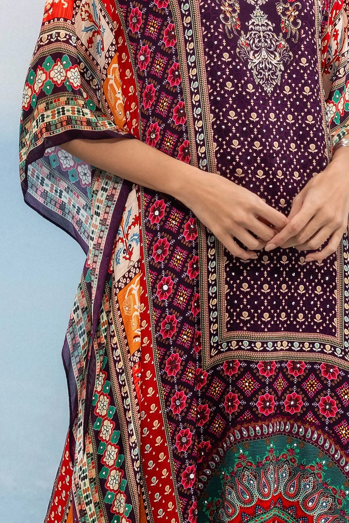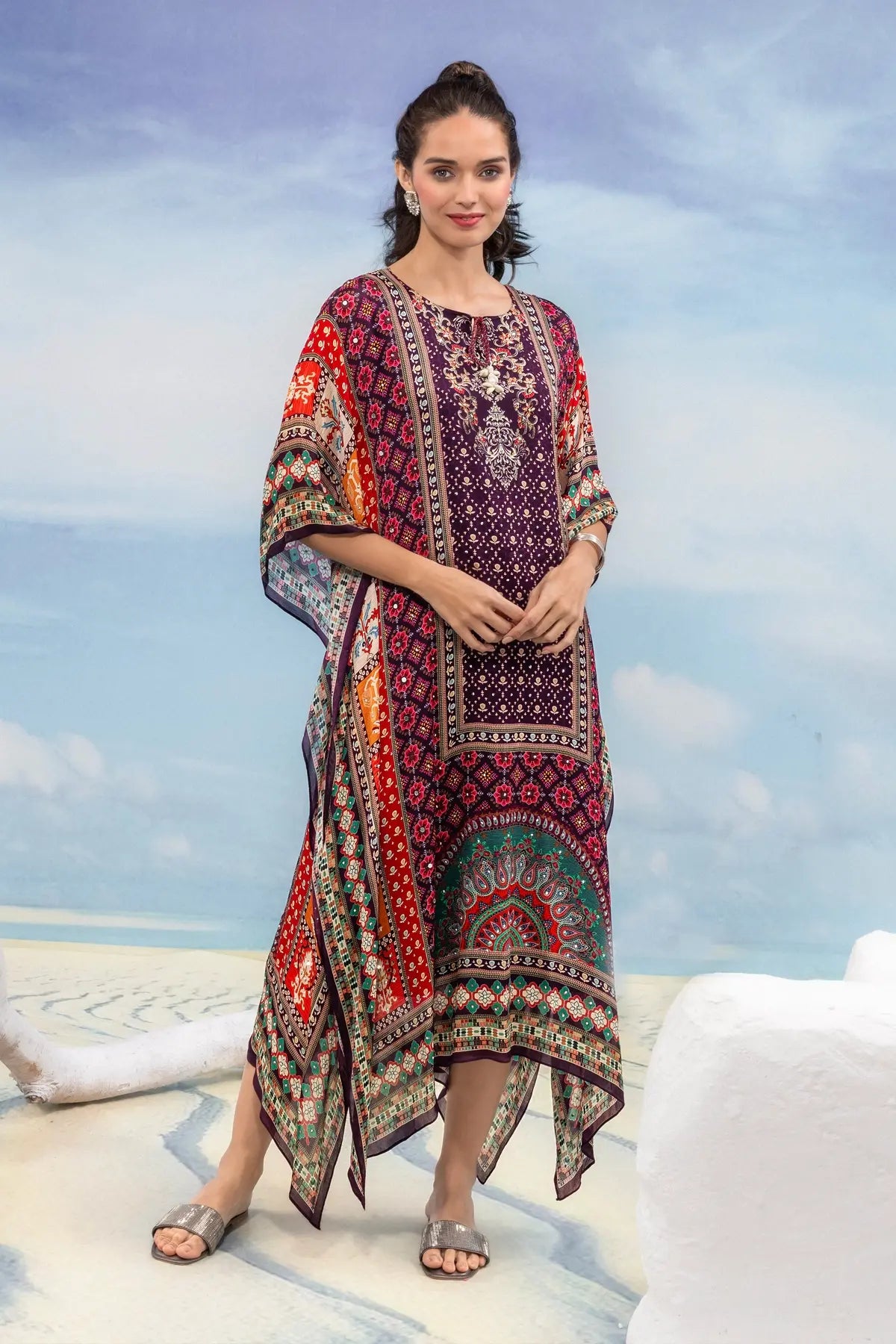 Experience a blend of ethnic charm and modern style with this Maroon Kaftan from PinkPhulkari. Crafted from high-quality Viscose Chinon silk, the fabric features a sophisticated crinkled texture. The design showcases a vibrant multi-colored ethnic print, further enhanced with delicate embroidered embellishments and reflective accents that add a subtle sparkle to the flowy silhouette.