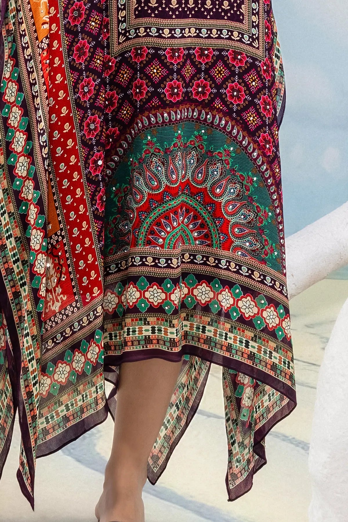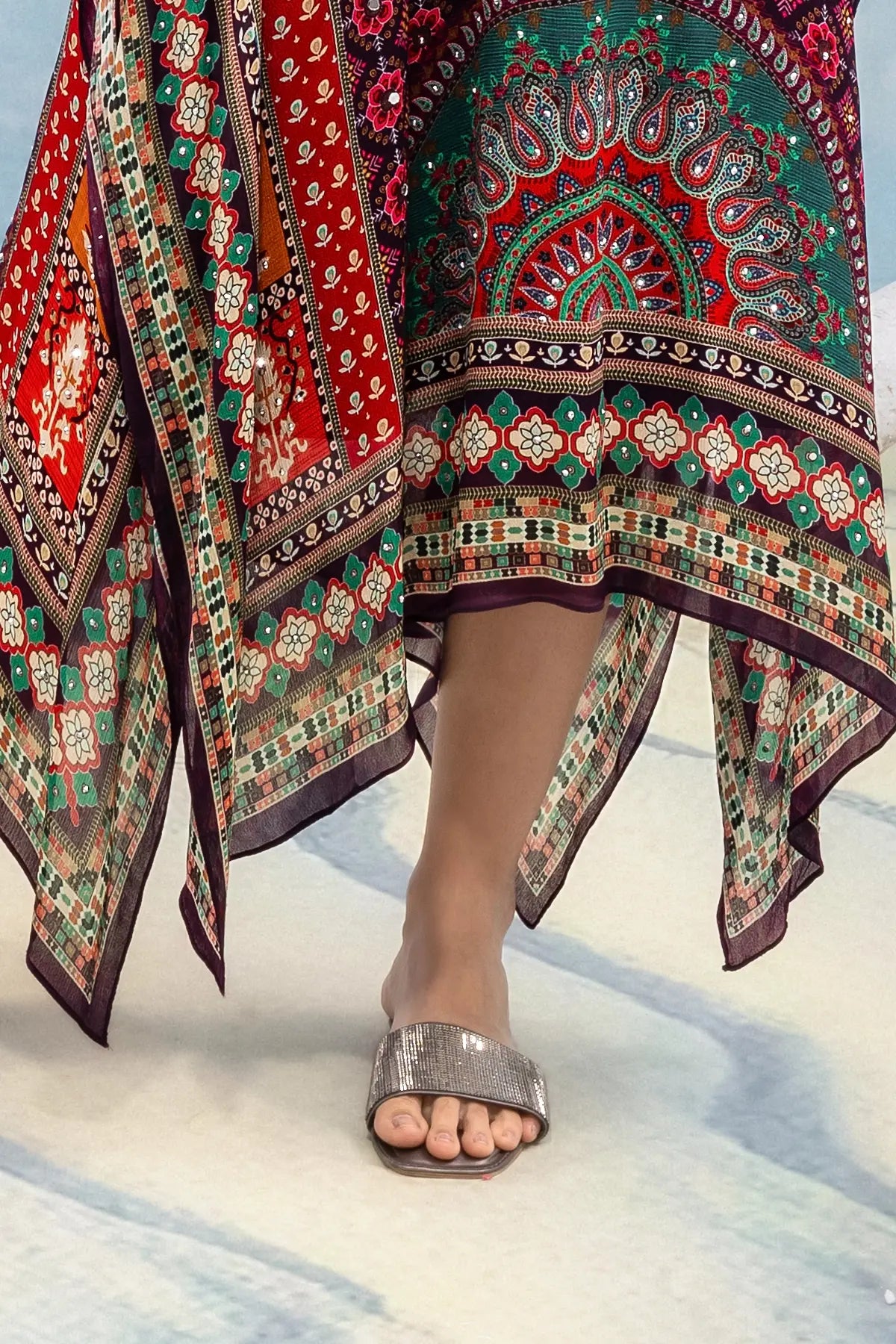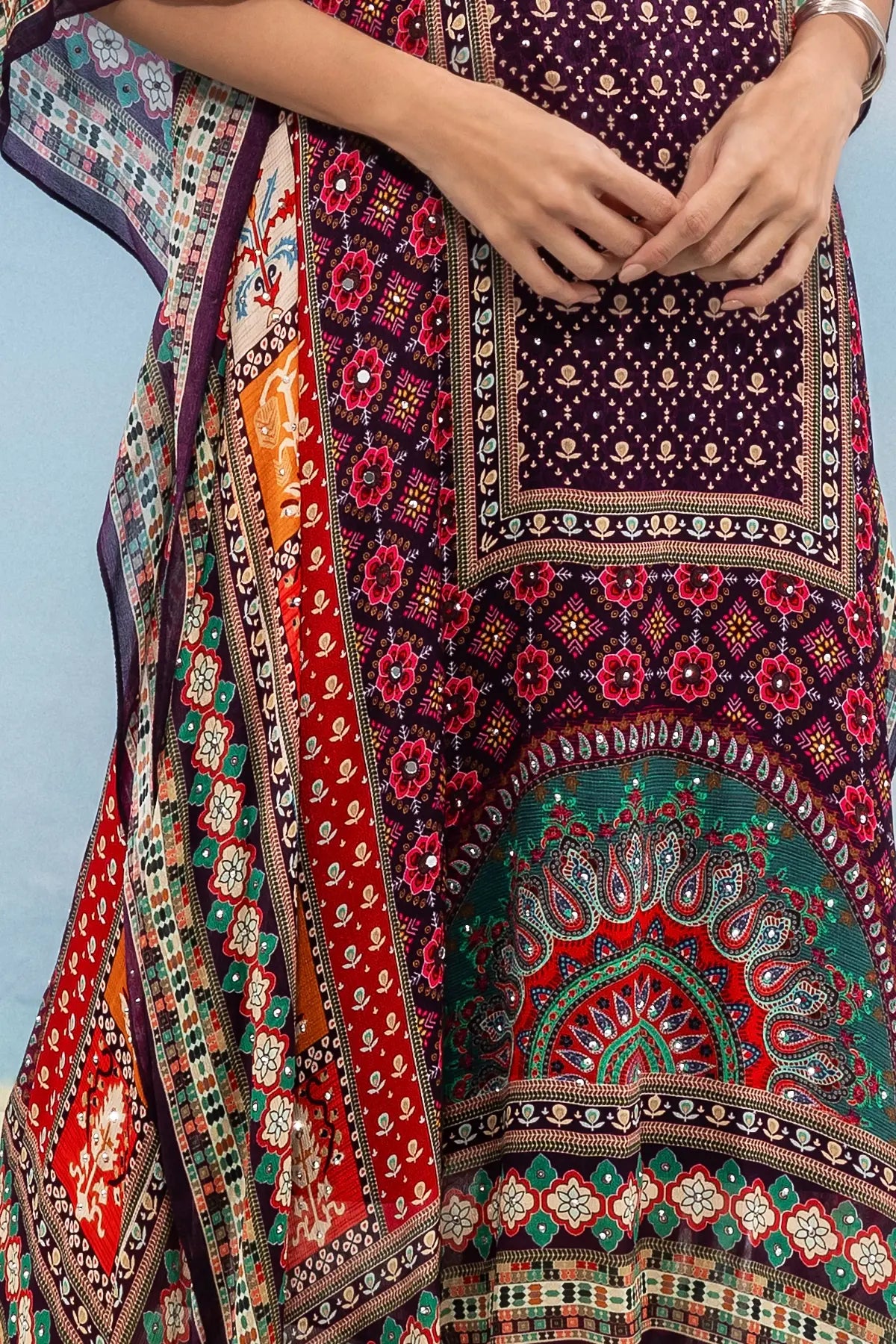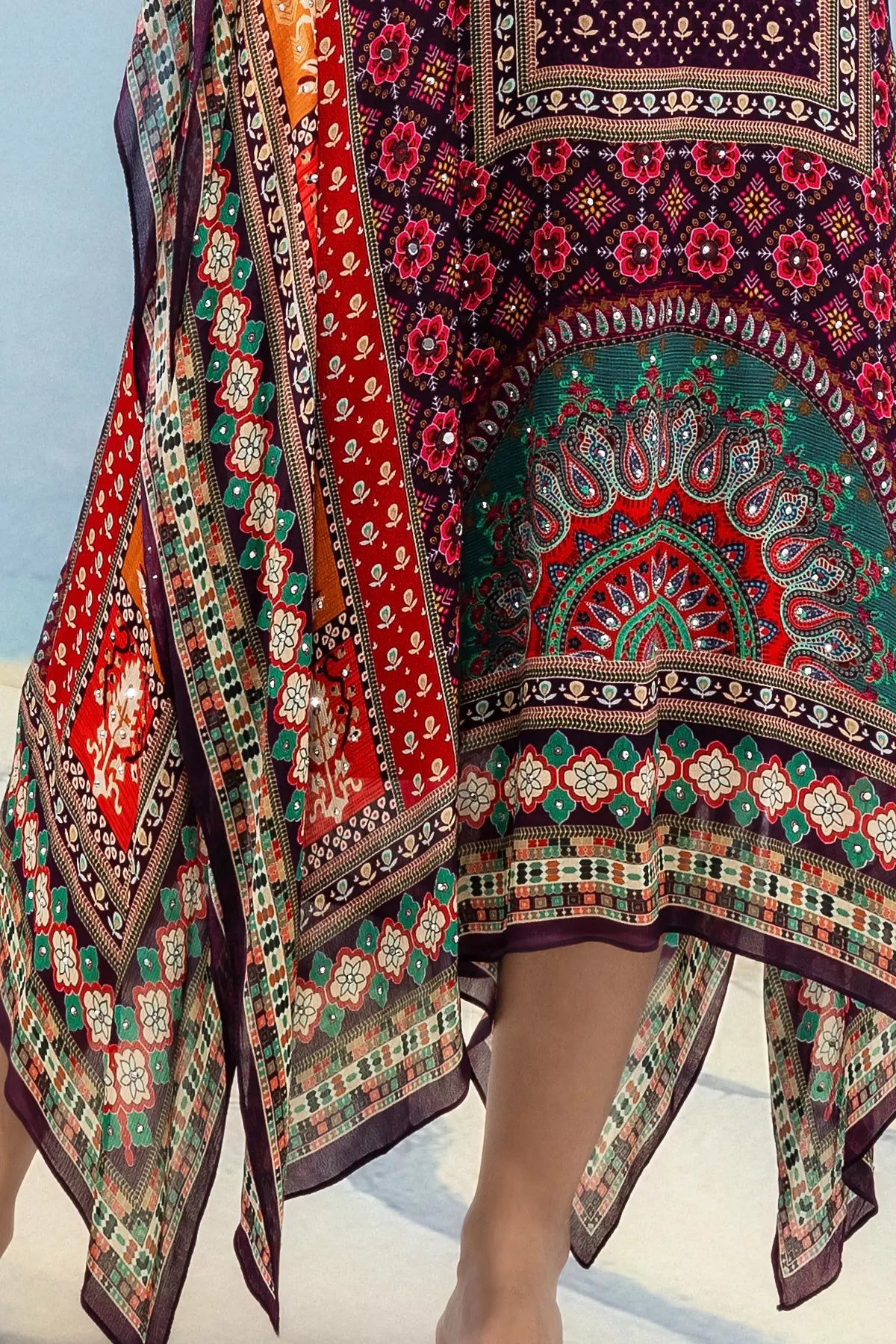 Experience a blend of ethnic charm and modern style with this Maroon Kaftan from PinkPhulkari. Crafted from high-quality Viscose Chinon silk, the fabric features a sophisticated crinkled texture. The design showcases a vibrant multi-colored ethnic print, further enhanced with delicate embroidered embellishments and reflective accents that add a subtle sparkle to the flowy silhouette.