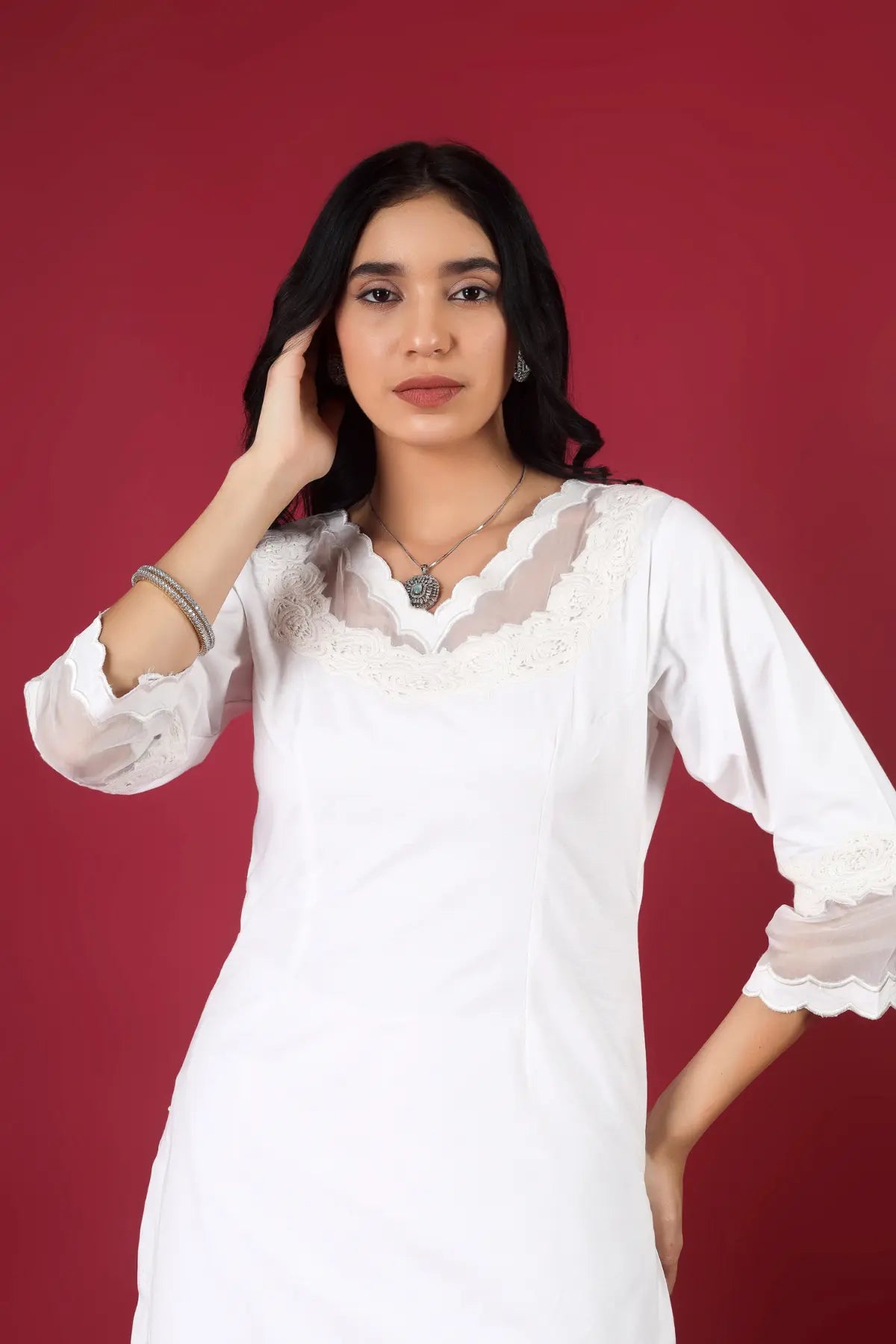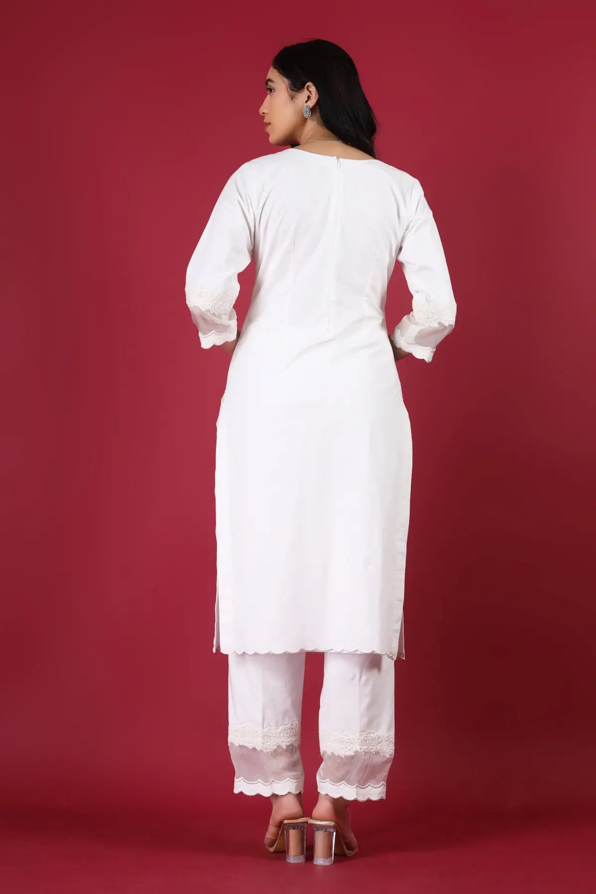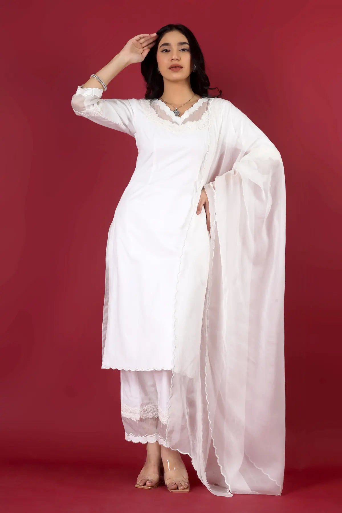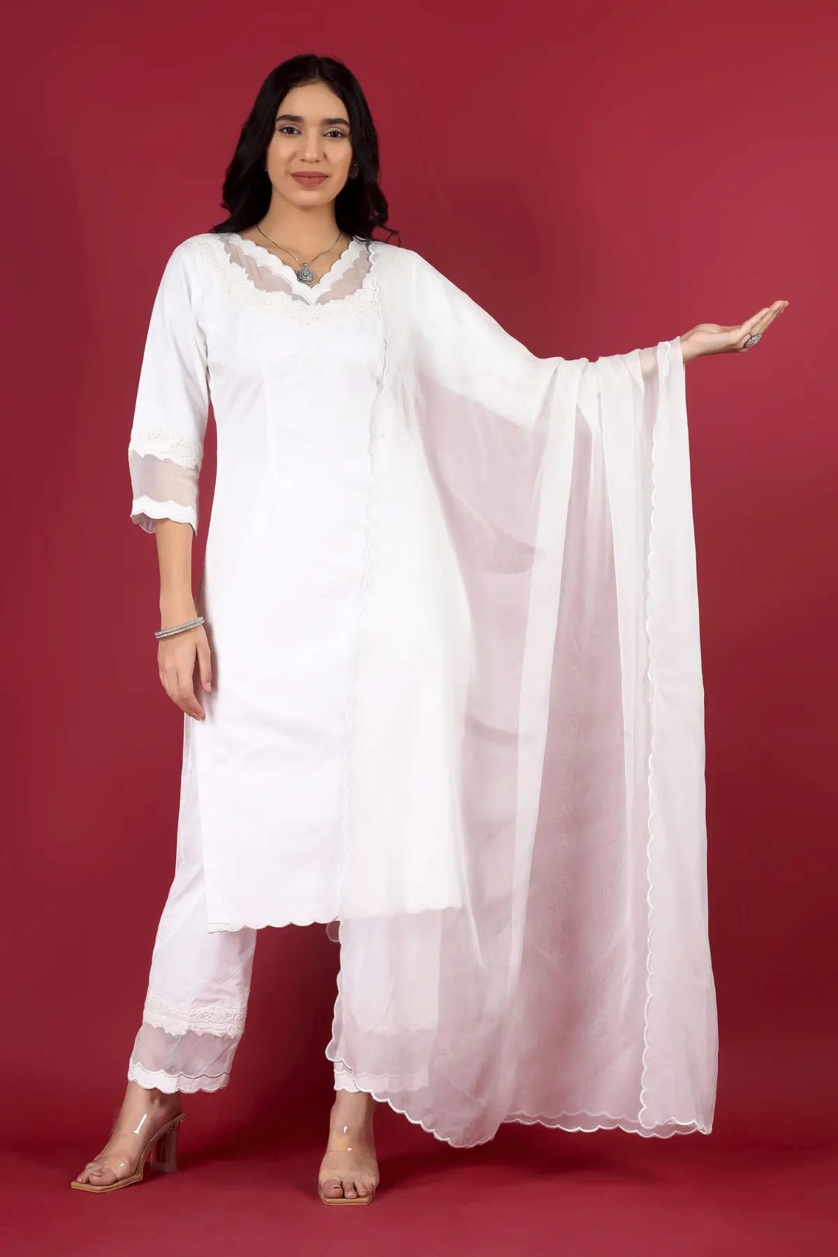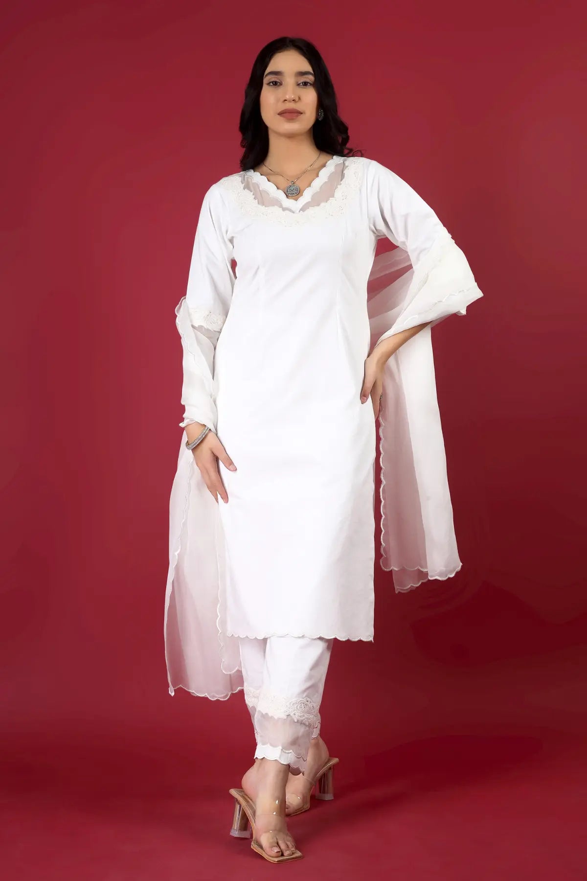 Embrace understated elegance with this sophisticated Off-White Kurta Pant Set. Crafted from breathable linen cotton, the ensemble features a minimal yet refined aesthetic. The kurta is designed with a flattering V-neckline adorned with sheer organza inserts and delicate lace detailing. Paired with a light and airy organza dupatta featuring scalloped edges, this outfit is perfect for daytime festive events and intimate celebrations.