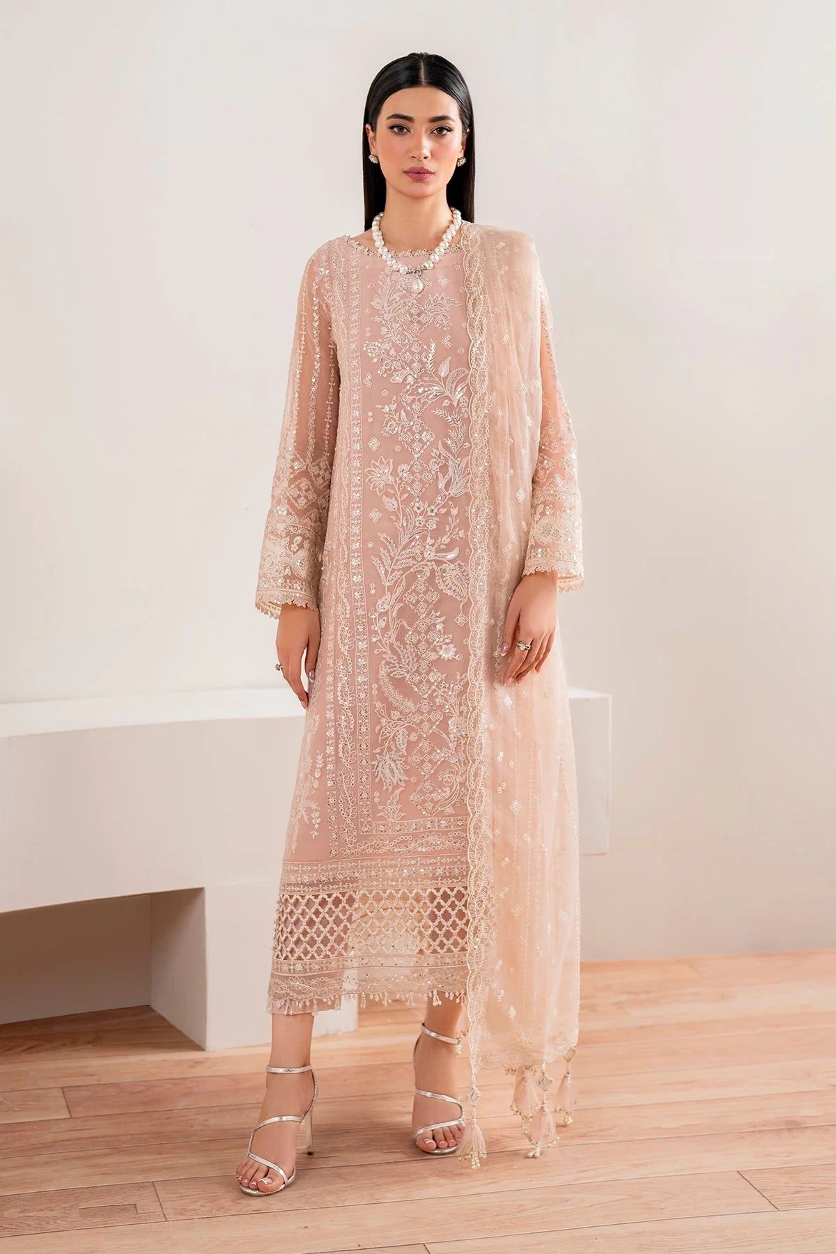 This elegant Peach Pink Hand Embroidered Chiffon Suit Set features intricate embroidery on chiffon base and dazzling sequin accents on the front, back, and sides. Delicate embroidery with sequins adorns the neckline and sleeves, elevating the overall design. The set is complete with a luxurious organza dupatta and dyed silk trousers for a polished look.