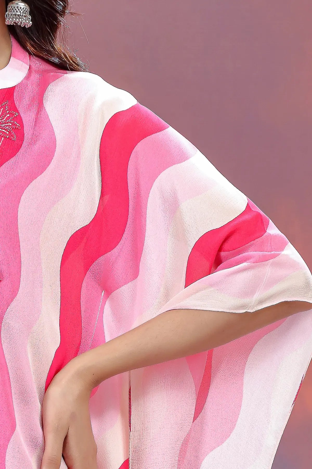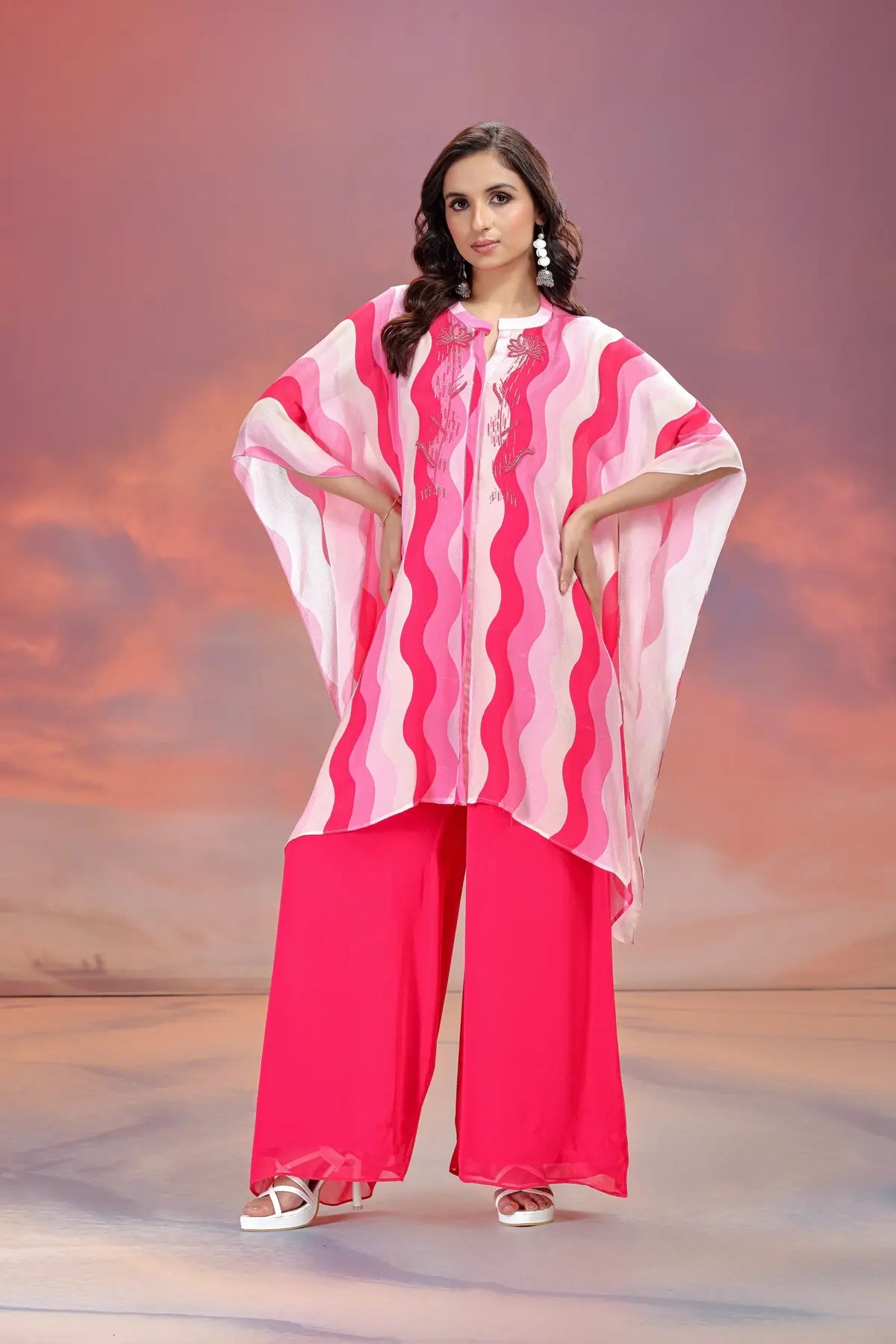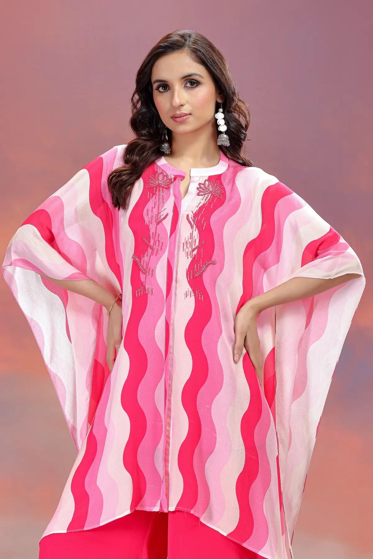 This ensemble is crafted from Premium Viscose Chinon Silk, known for its lightweight feel and beautiful fluid drape. The fabric features a striking multicolor wavy print in shades of hot pink, blush, and ivory. The highlight of the kaftan is the delicate hand-embroidery on the yoke, featuring floral motifs worked with tonal threads and subtle shimmering accents.