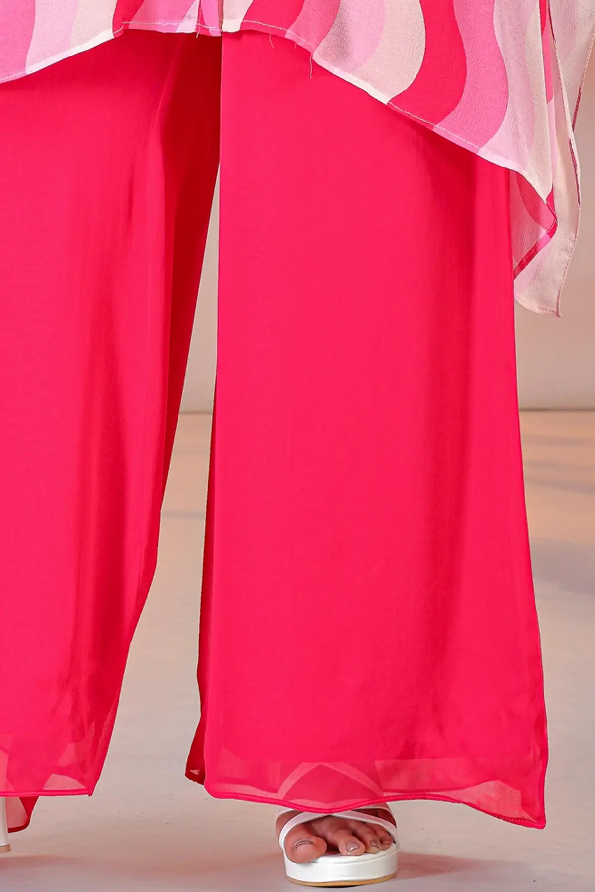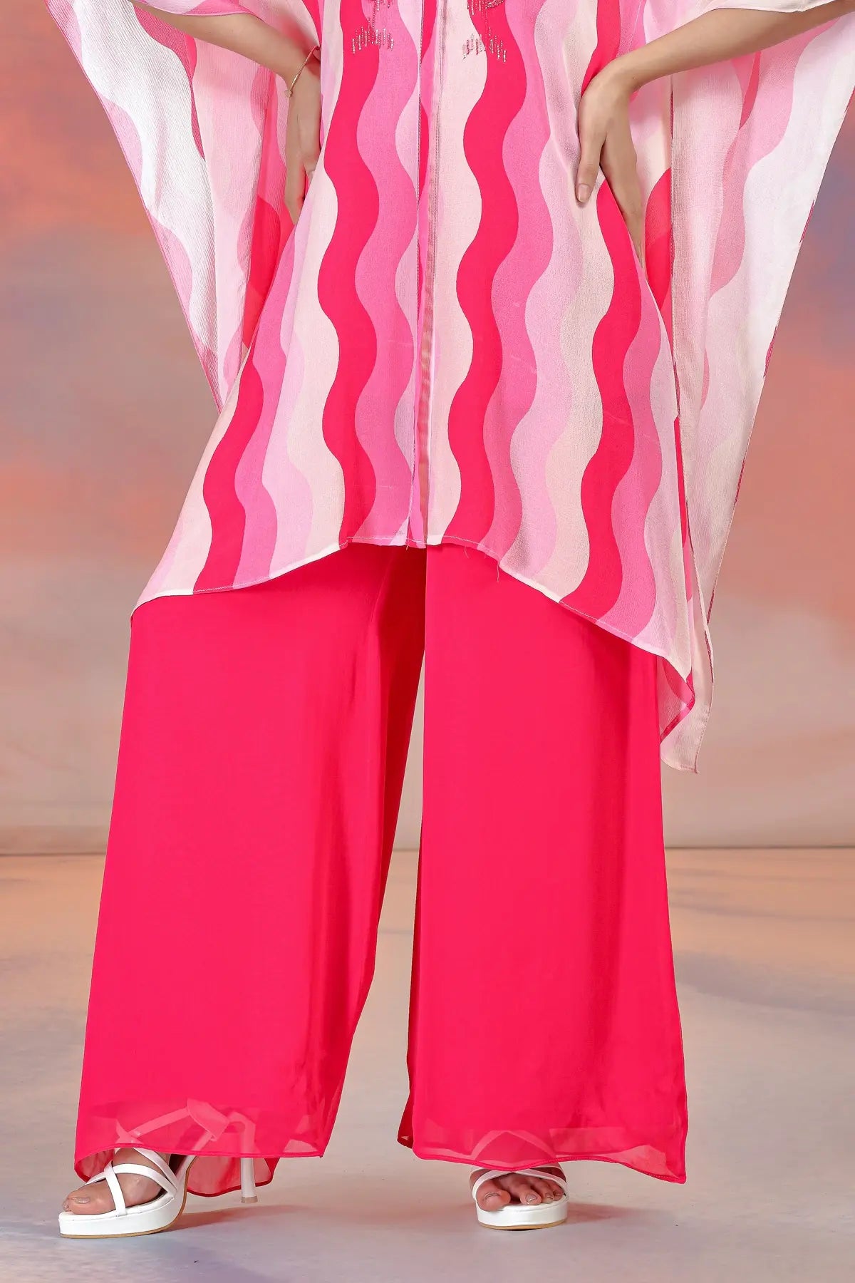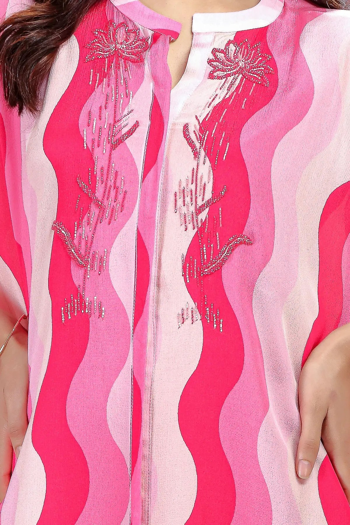 This ensemble is crafted from Premium Viscose Chinon Silk, known for its lightweight feel and beautiful fluid drape. The fabric features a striking multicolor wavy print in shades of hot pink, blush, and ivory. The highlight of the kaftan is the delicate hand-embroidery on the yoke, featuring floral motifs worked with tonal threads and subtle shimmering accents.