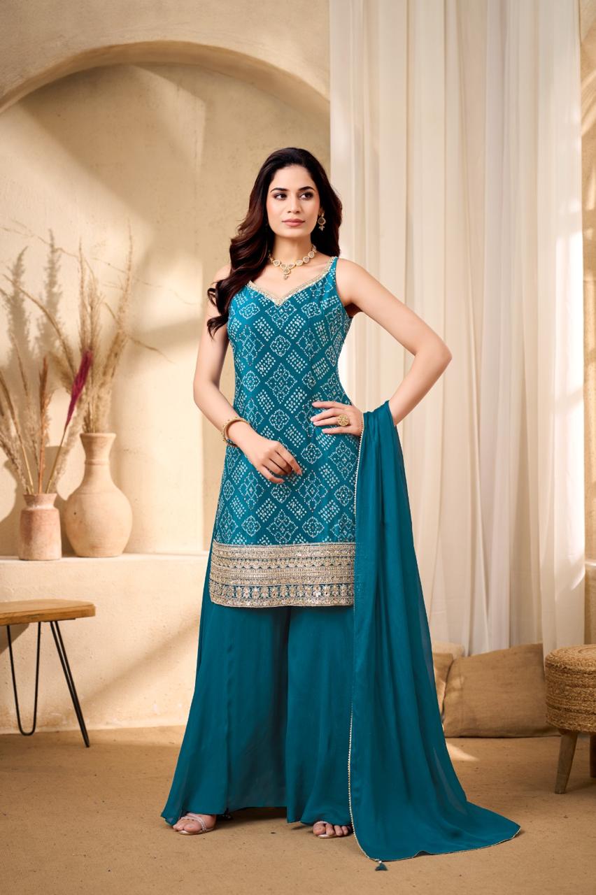 Teal Blue Chinon Silk Bandhani Embroidered Sharara Suit