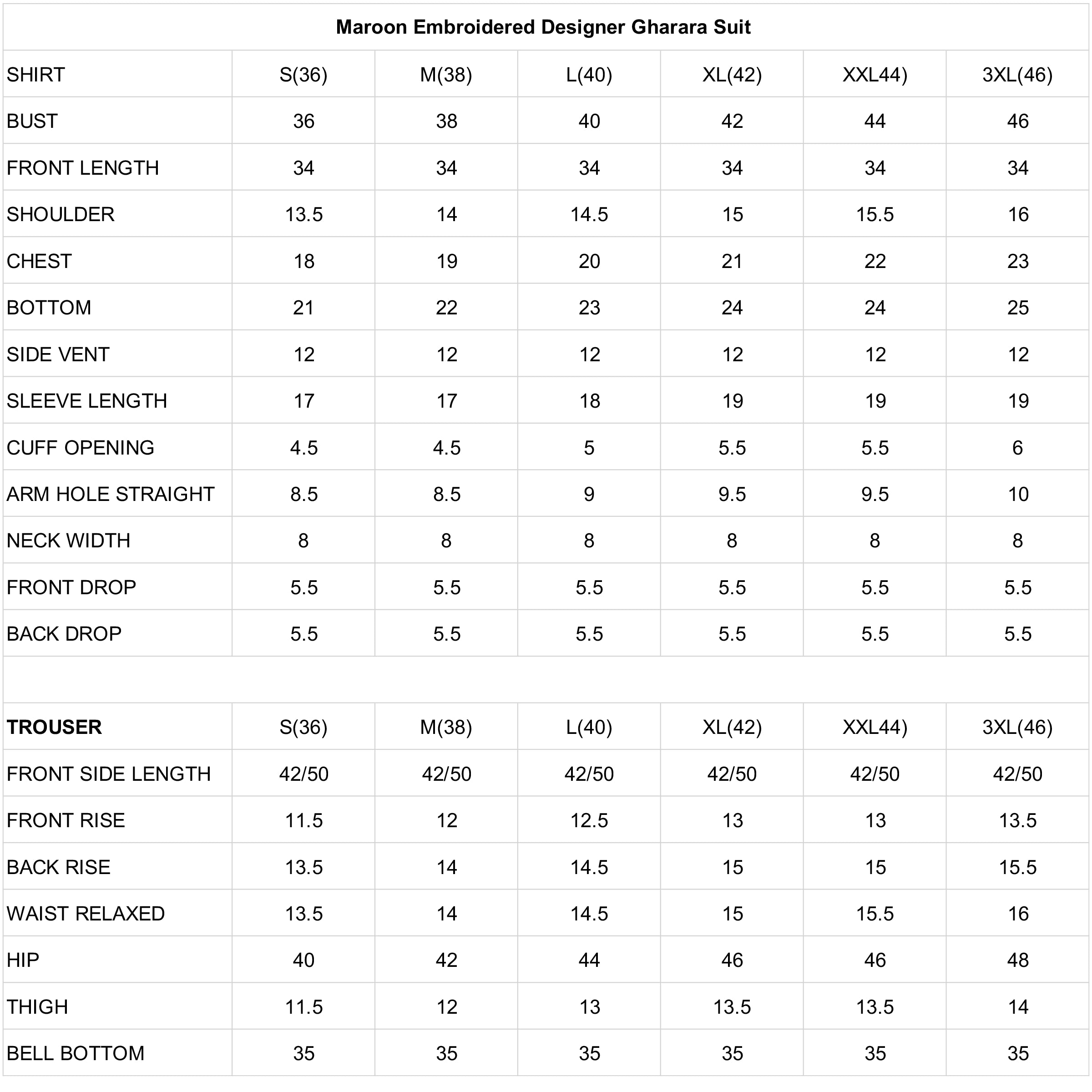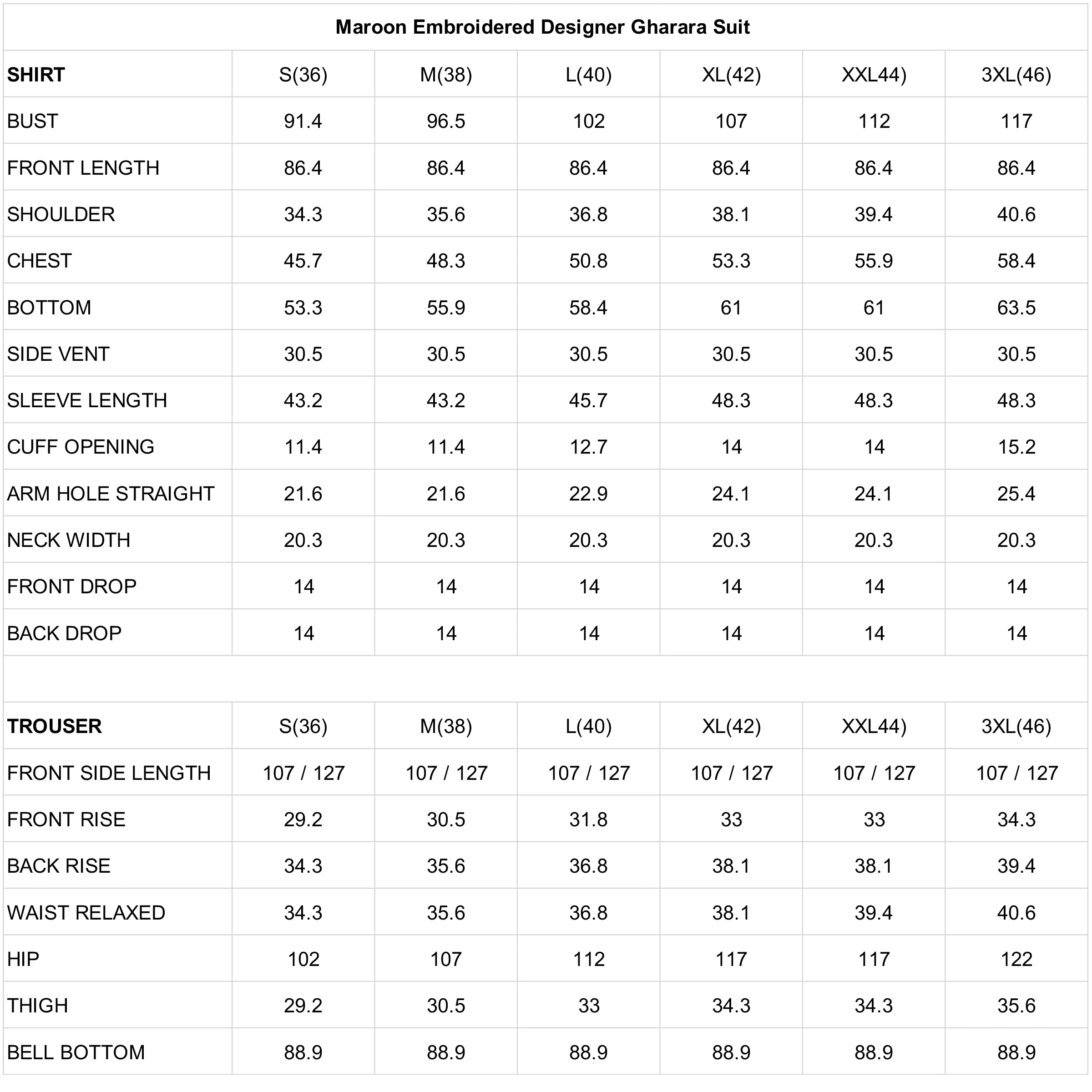 Please take exact body measurement. Then add 2 inches (or 3 inches) margin in it to arrive to your correct garment size. For example If your Bust size all around from widest part is 34 inches then garment size will be Size 36.