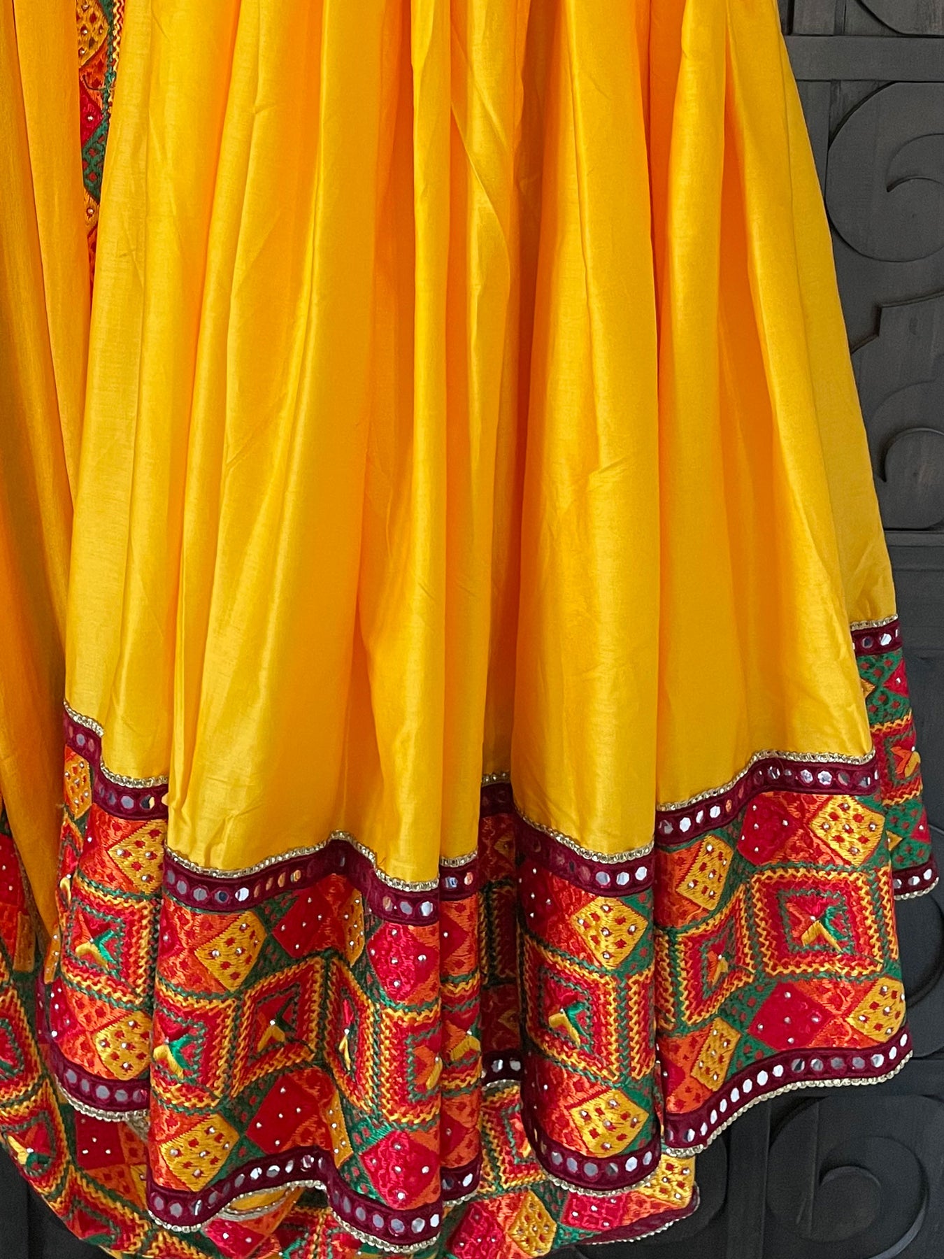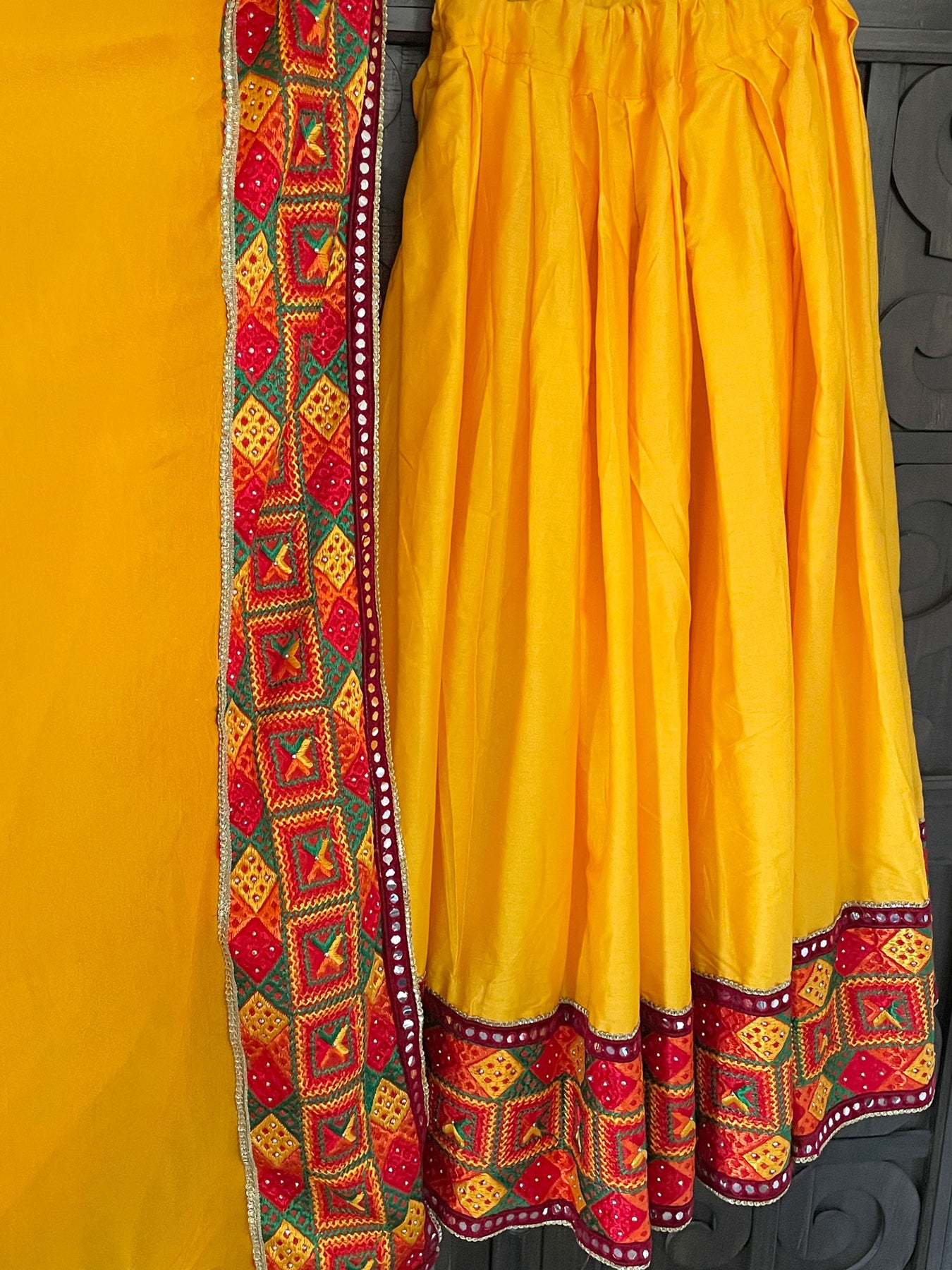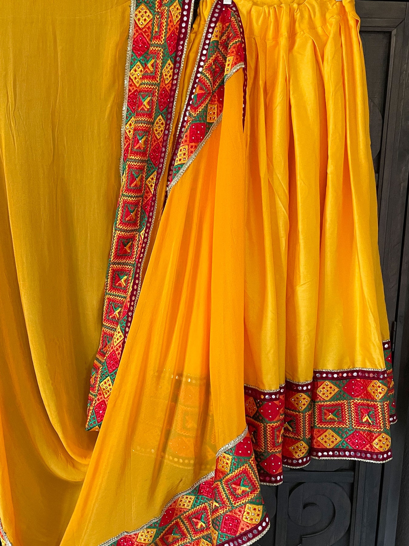 Women's Navaratri, Jaago Stylish India Wedding Phulkari Lehenga Long Flared Skirt Ghagra With Dupatta(2pc). Traditional Phulkari embroidery border on bottom of skirt and on border of chinon silk dupatta. Beautiful phulkari work long skirt/lehenga comfortable drawstring waistband with golden latkans. Team it up with a bright colored kurti and a Punjabi jutti for complete festive look.