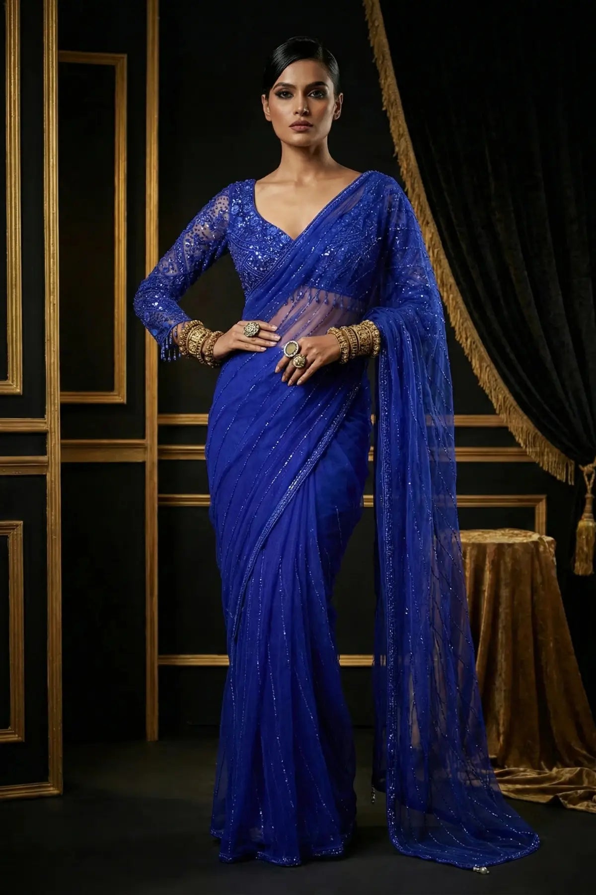 Full front view of model in Blue Sapphire Net Sequin Handwork Royal Saree with hand-embellished sequins and bead artistry.