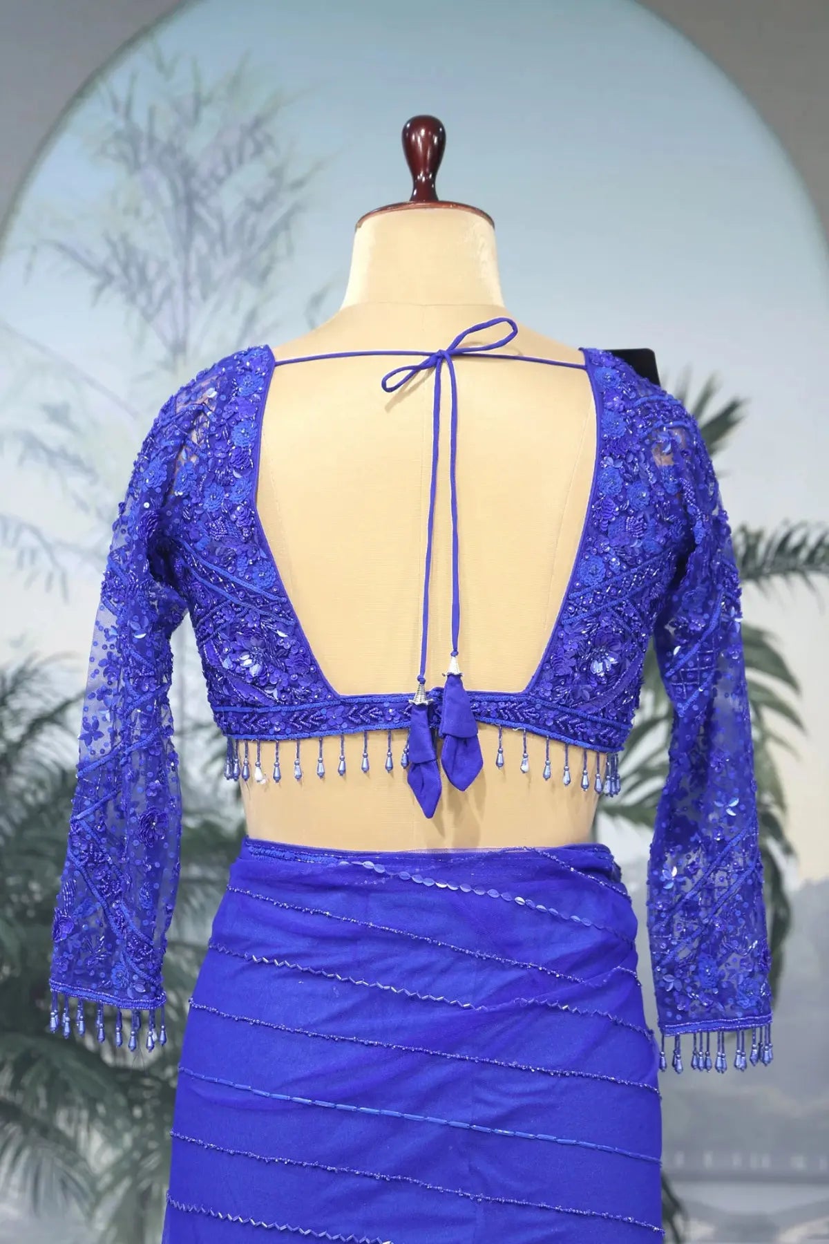This ensemble includes a ready-made blouse meticulously designed with a deep V-neckline and long sheer sleeves. The blouse and sleeve cuffs are beautifully finished with delicate hanging bead droplets for an artisanal touch. The back of the blouse features a deep U-cut with a thin tie-up dori and matching tassels for a structured yet graceful fit. The fluid nature of the net fabric ensures an effortless drape, perfect for premium evening celebrations.