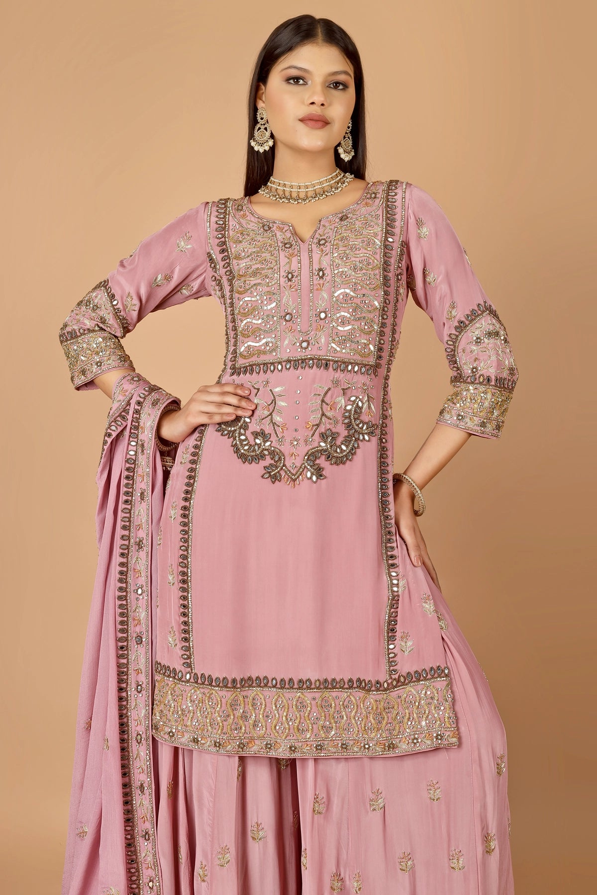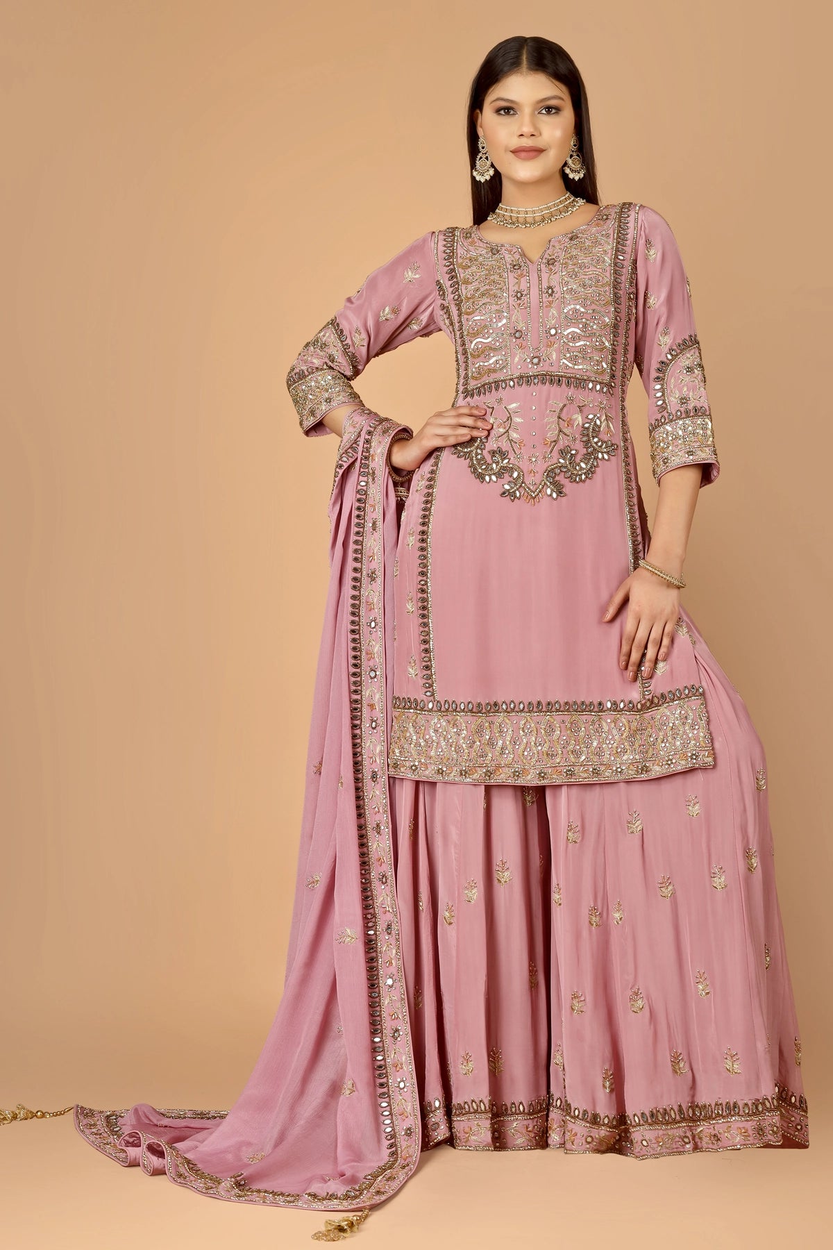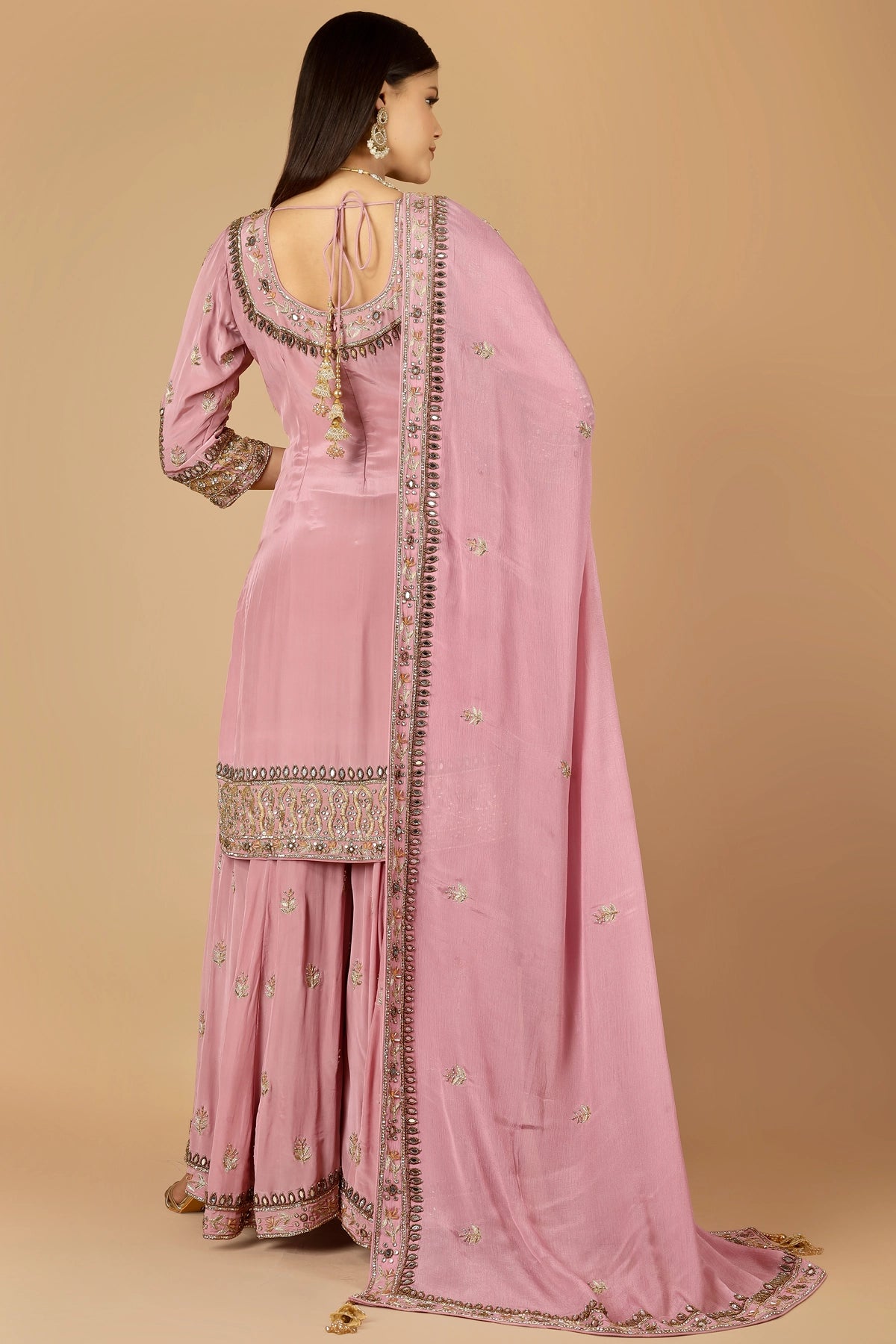 Luxury Elegant Mauve Pink Hand-Embroidered Crepe Sharara Set
