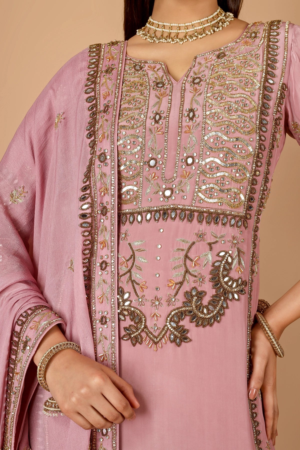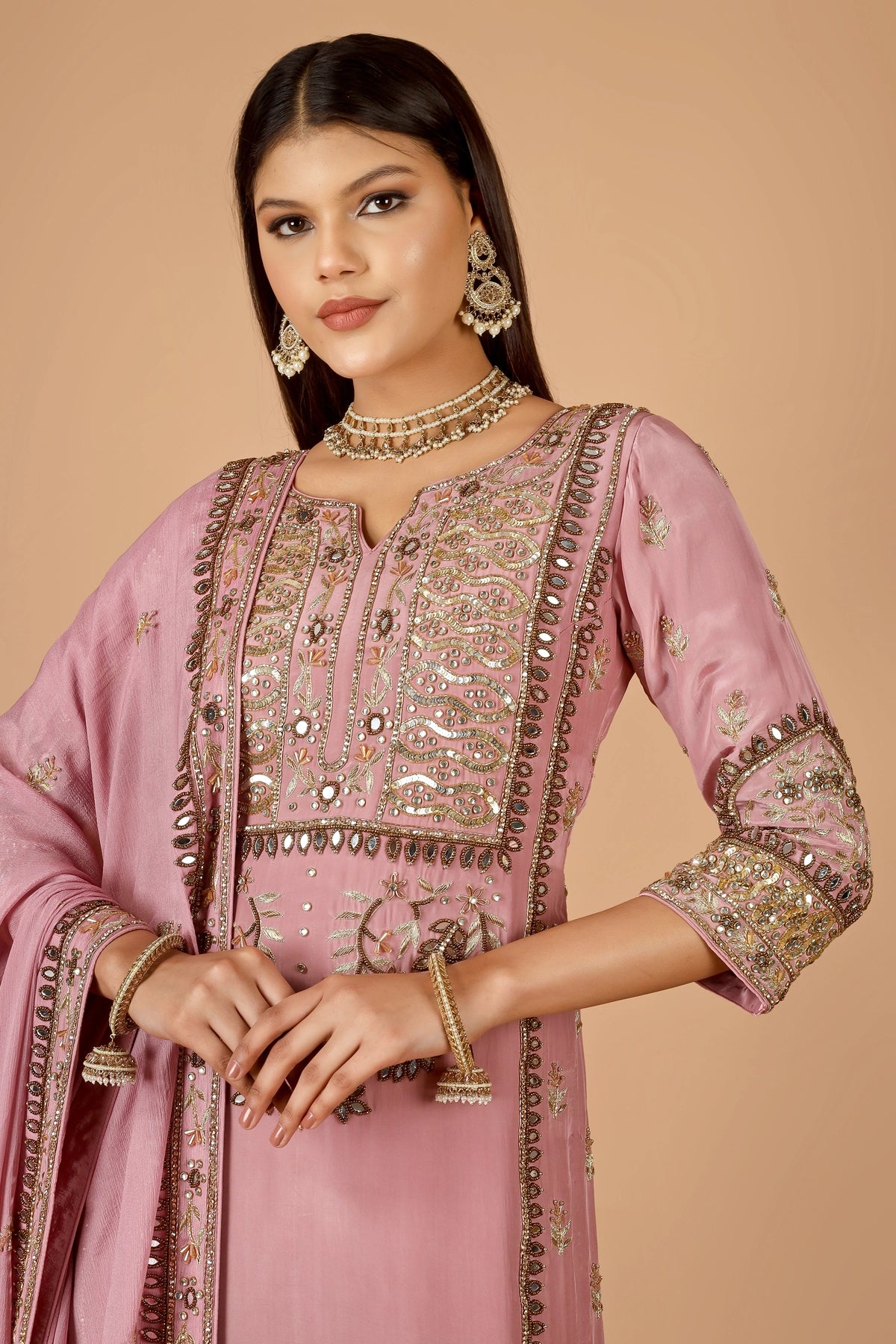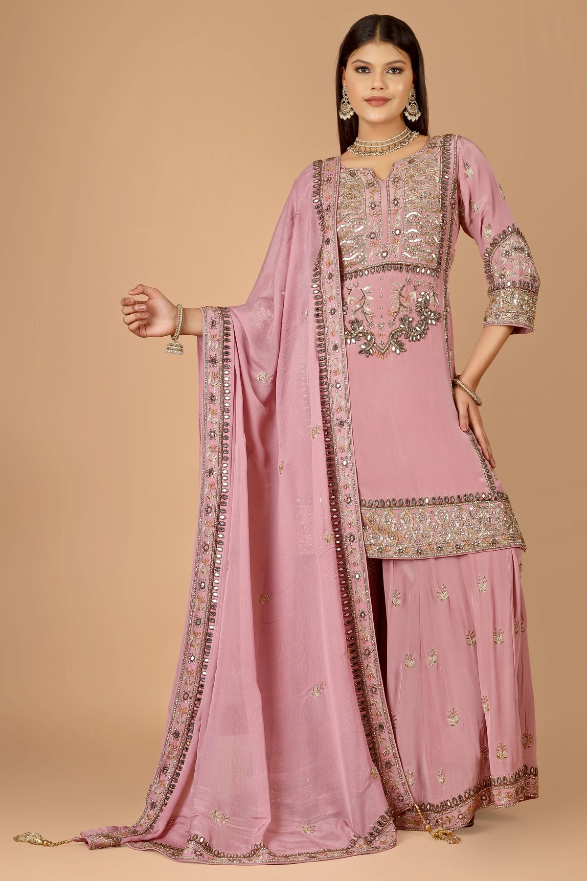 Luxury Elegant Mauve Pink Hand-Embroidered Crepe Sharara Set