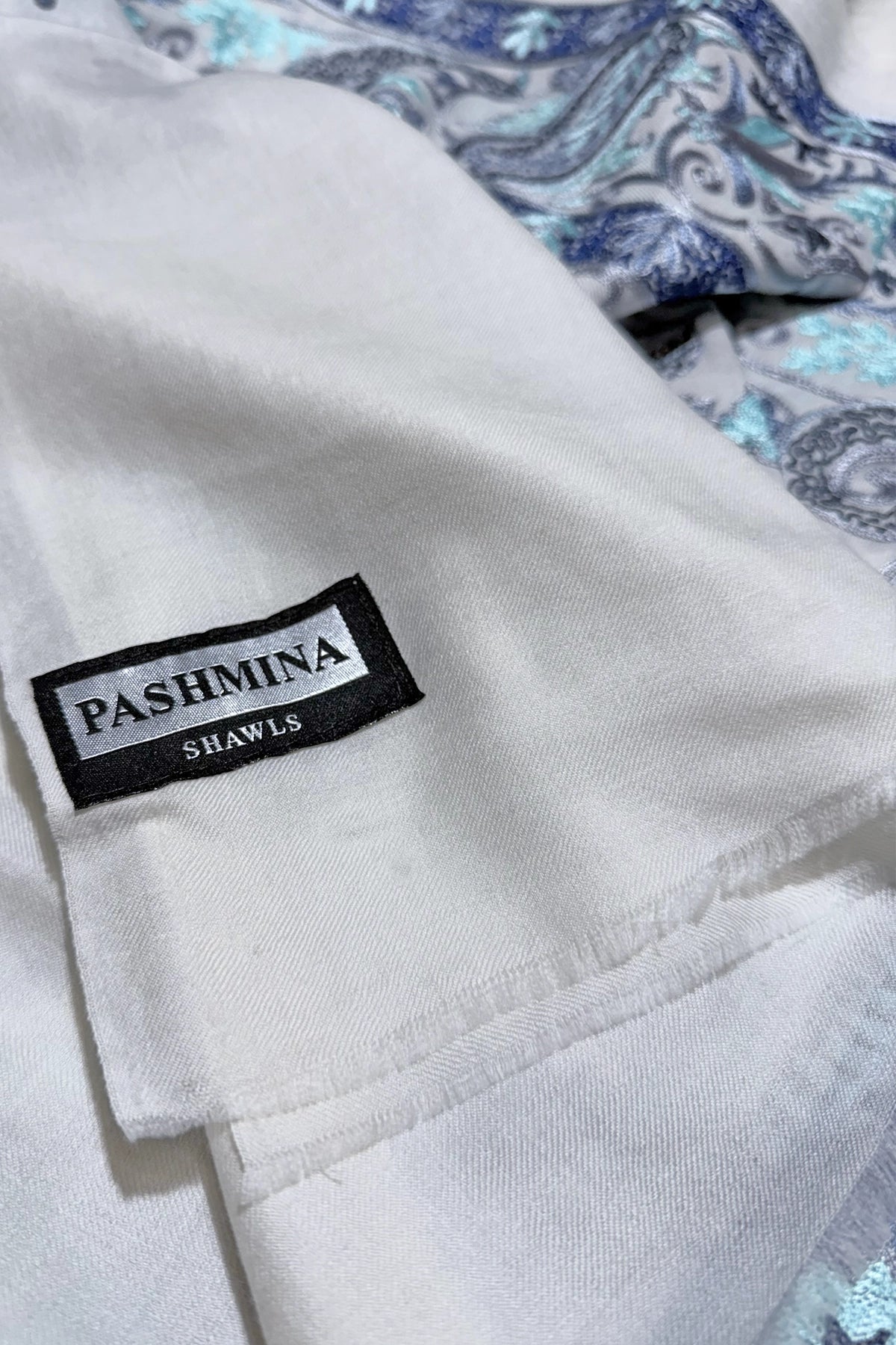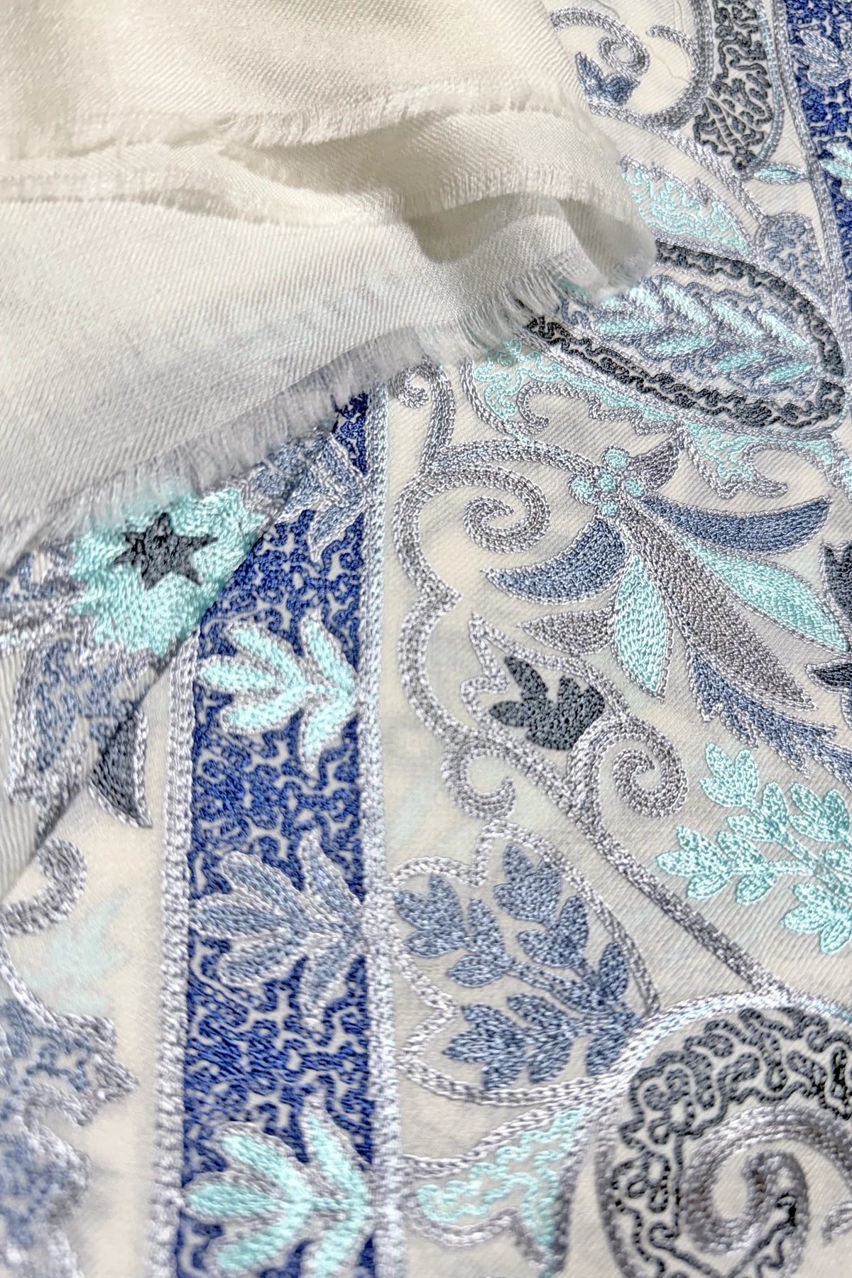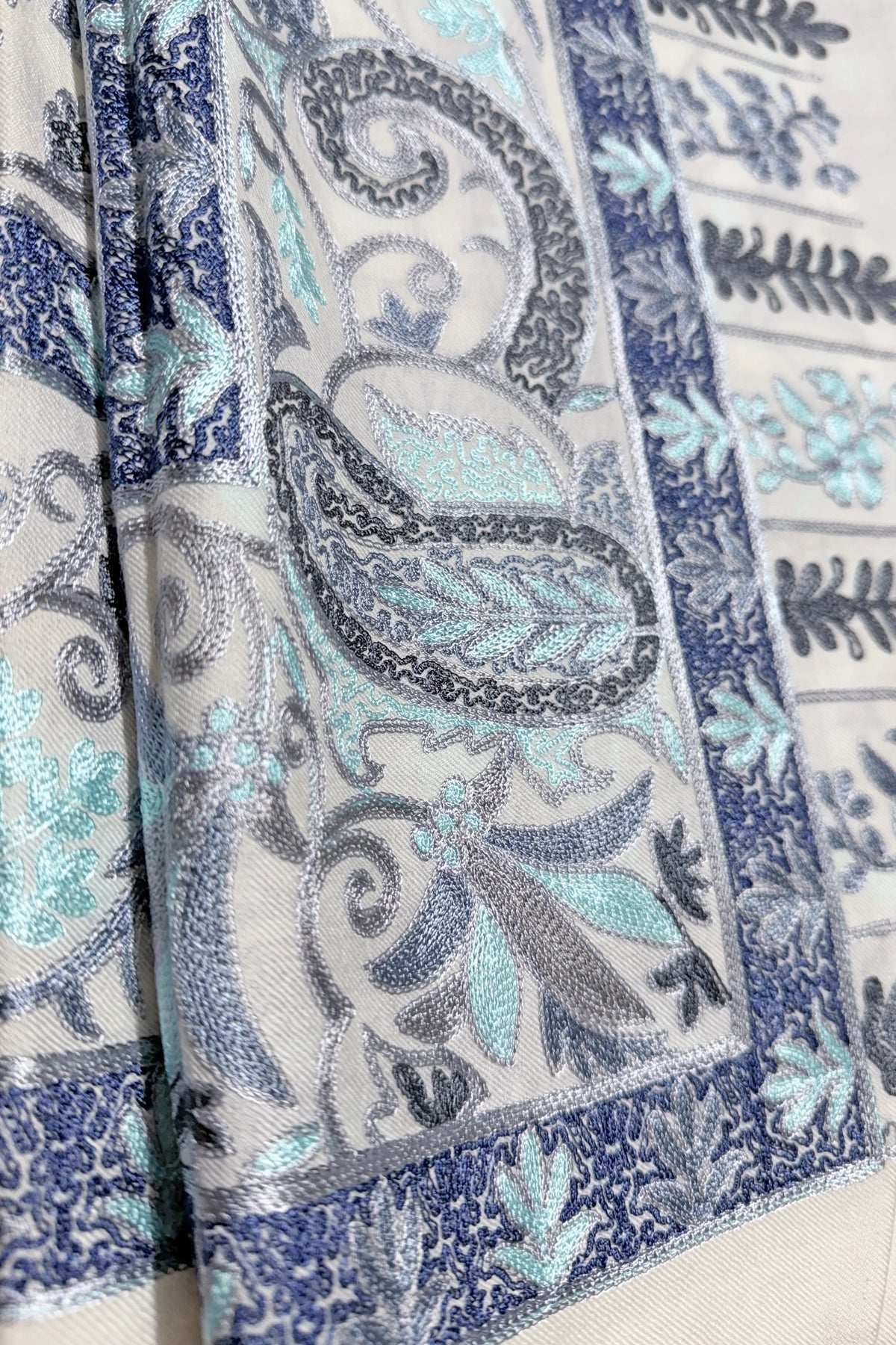 Close-up of a aari work pashmina shawl wrap  with paisley design in blue, gray, and white.