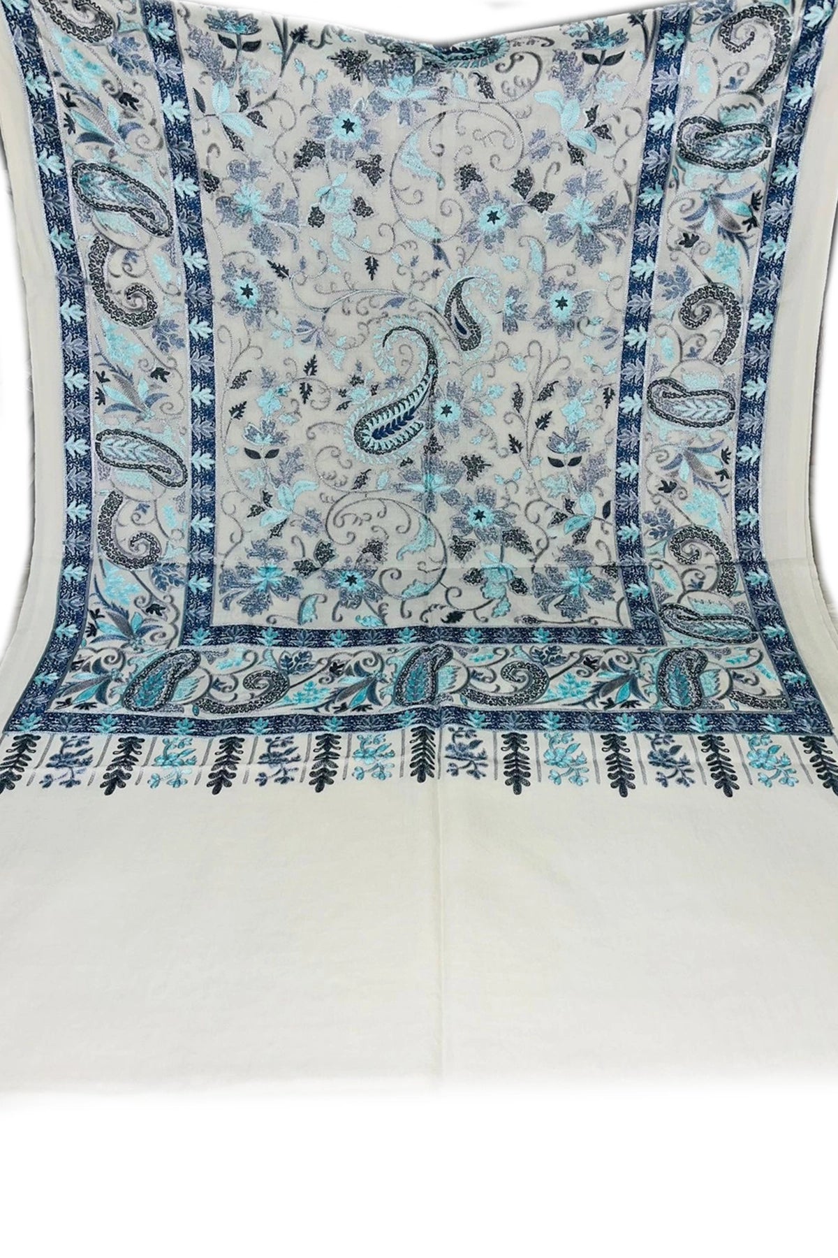 Aari work pashmina shawl wrap  with paisley design in blue, gray, and white.
