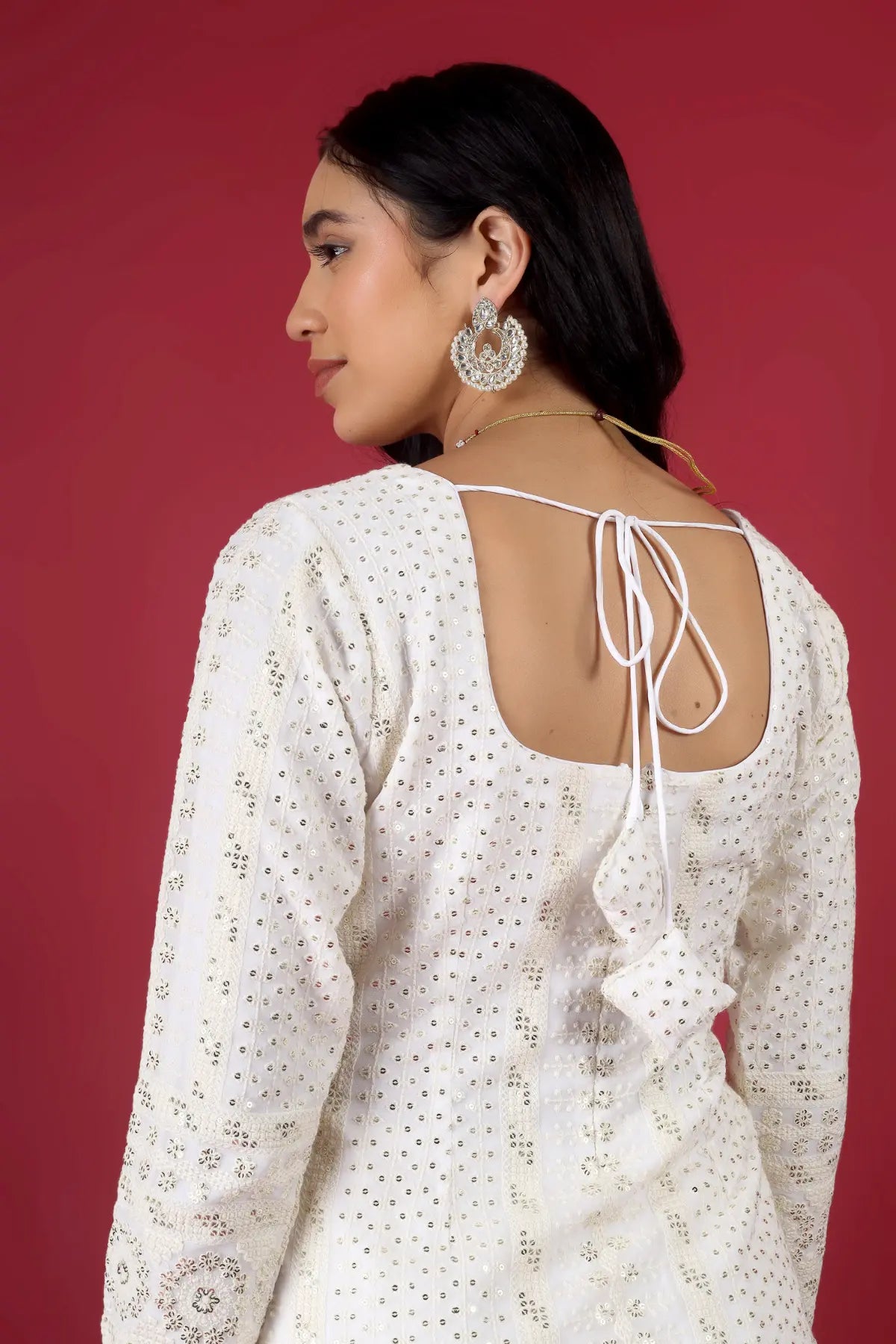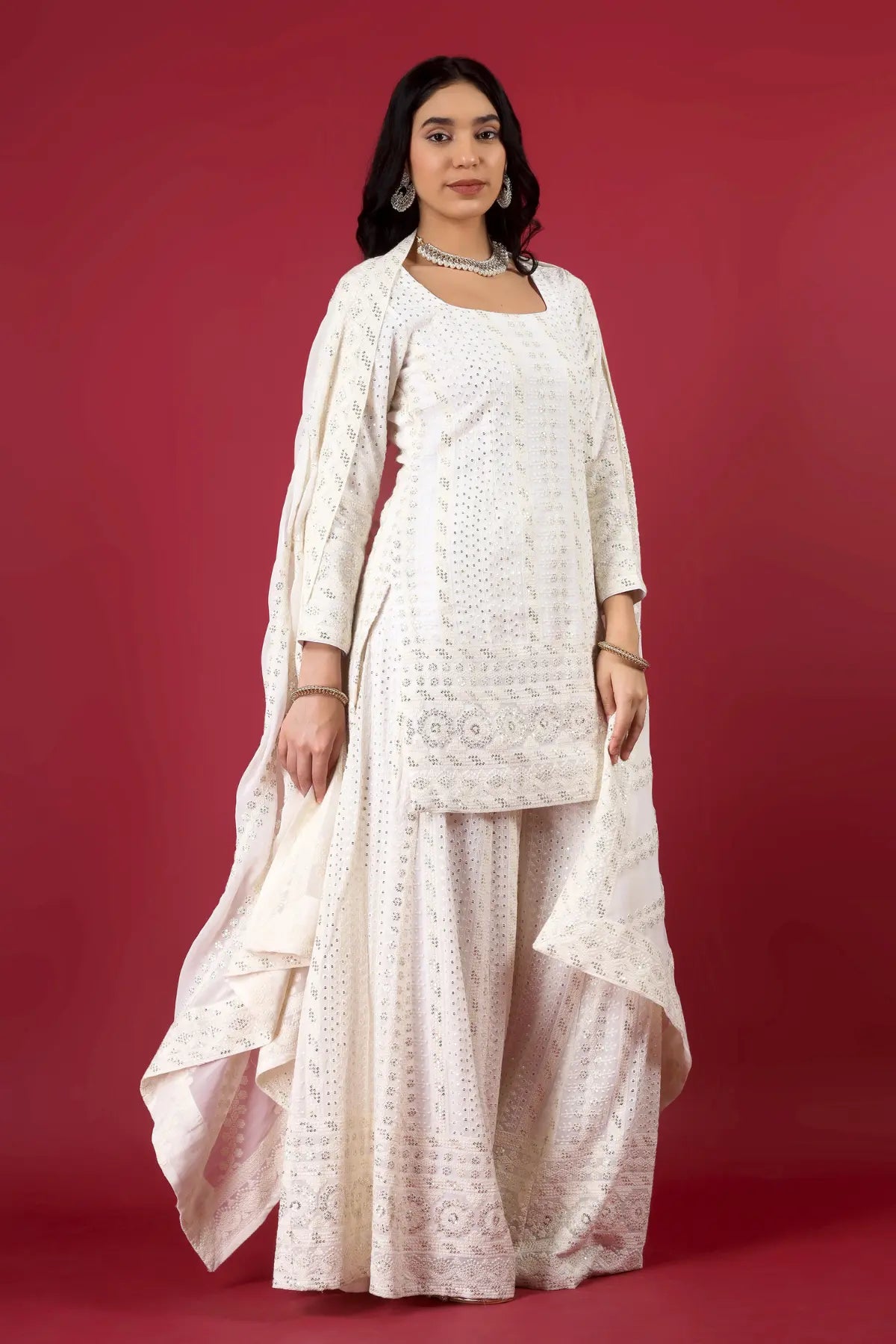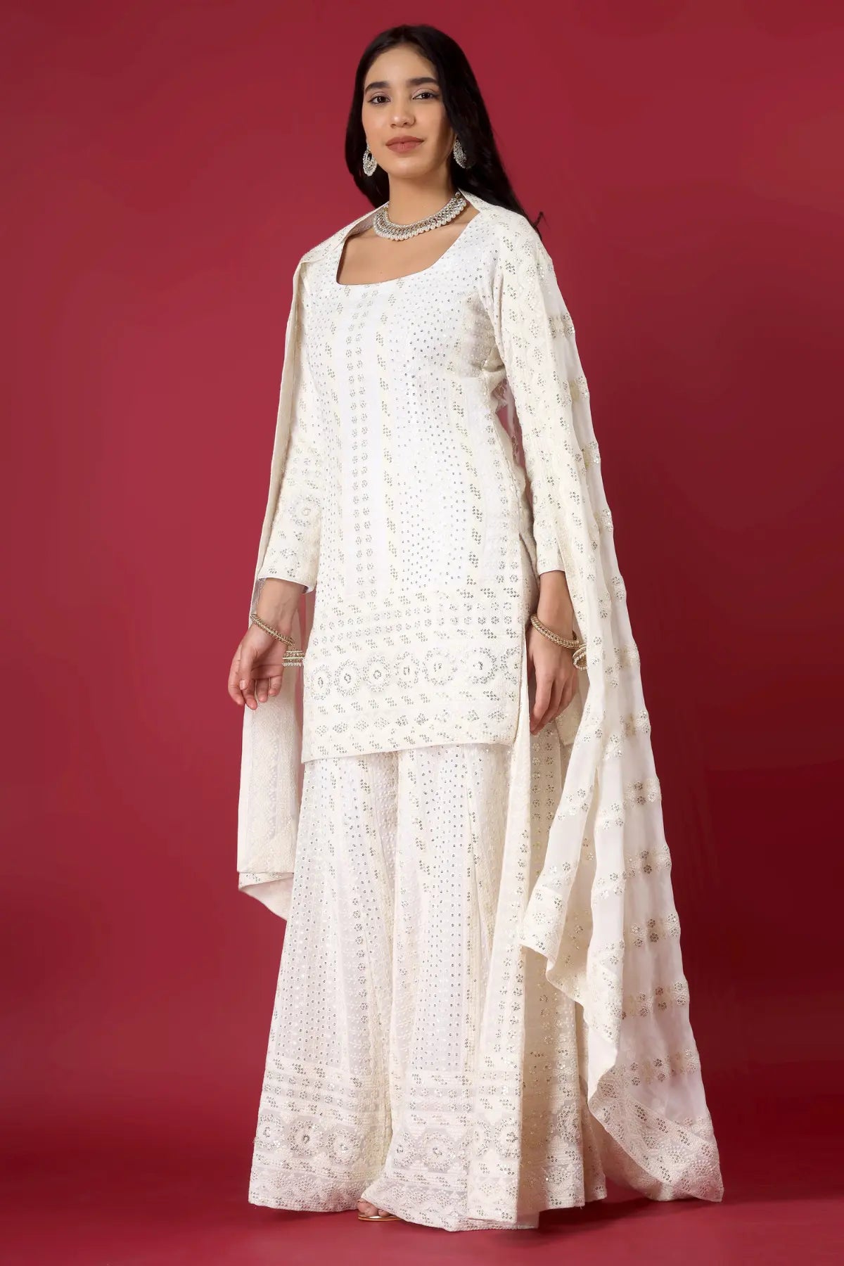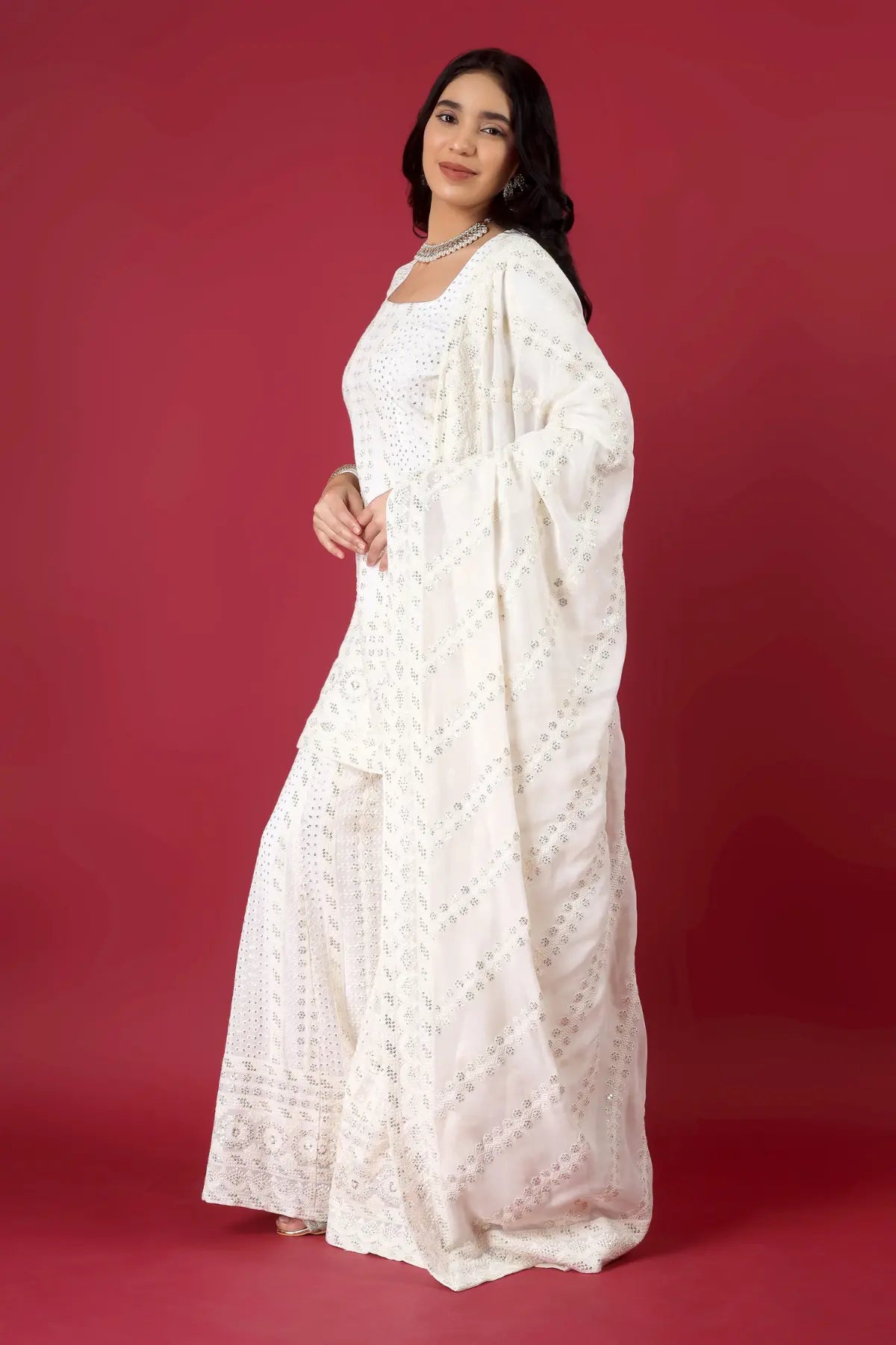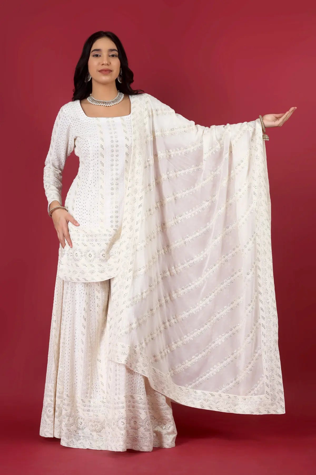 Dupatta: Lightweight Chinon silk dupatta with embroidery and work details.