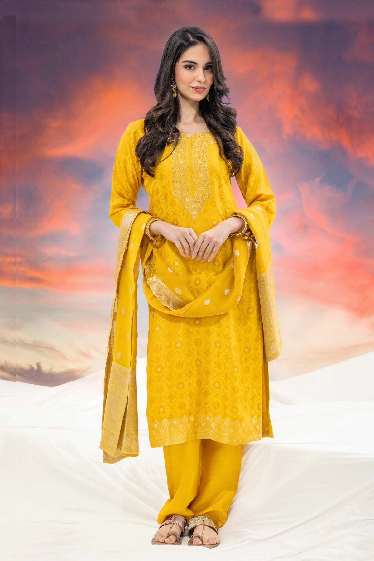 Elegant yellow & gold brocade Russian silk straight kurta set with delicate stone work. Includes straight-cut kurta, Russian Silk pants with elastic back, and matching brocade dupatta. Perfect for festive and formal occasions.