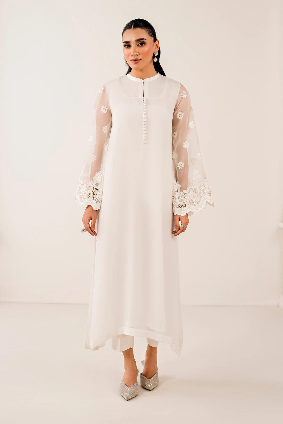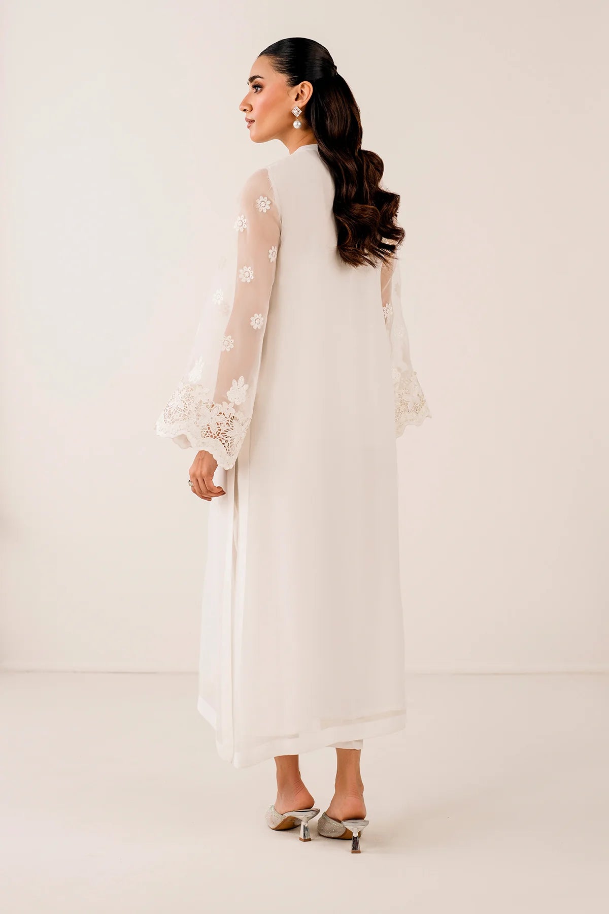 Experience minimalist luxury with this White 2-piece suit from Baroque. Crafted from premium chiffon, the shirt features a sophisticated aesthetic with an emphasis on texture and detail. The highlight of the ensemble is the beautifully embroidered sheer sleeves, showcasing intricate floral motifs and heavy lace-work borders that add a touch of elegance to the clean silhouette.