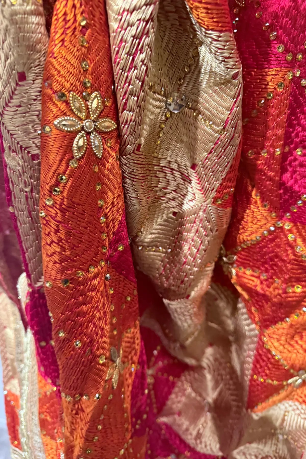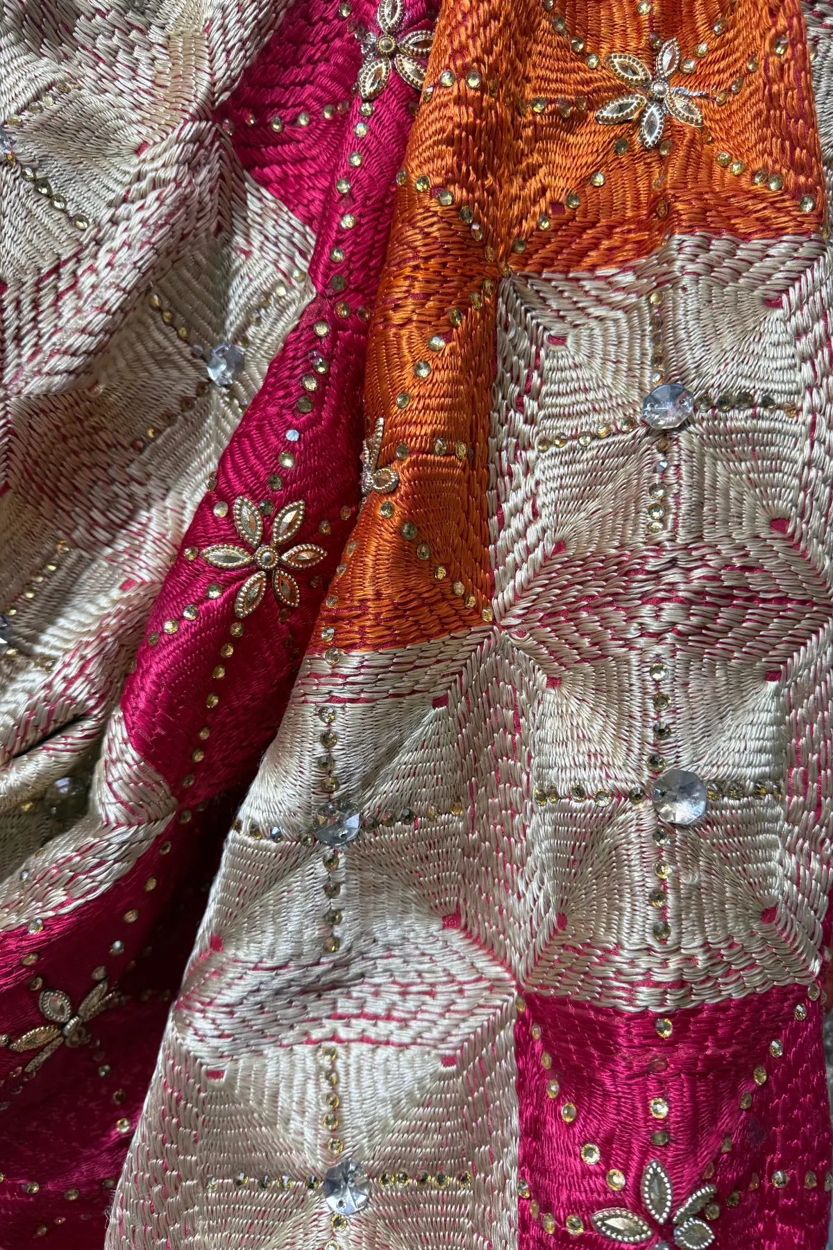 Close-up of shimmering stones and cupped sequins integrated into the floral Phulkari embroidery.
