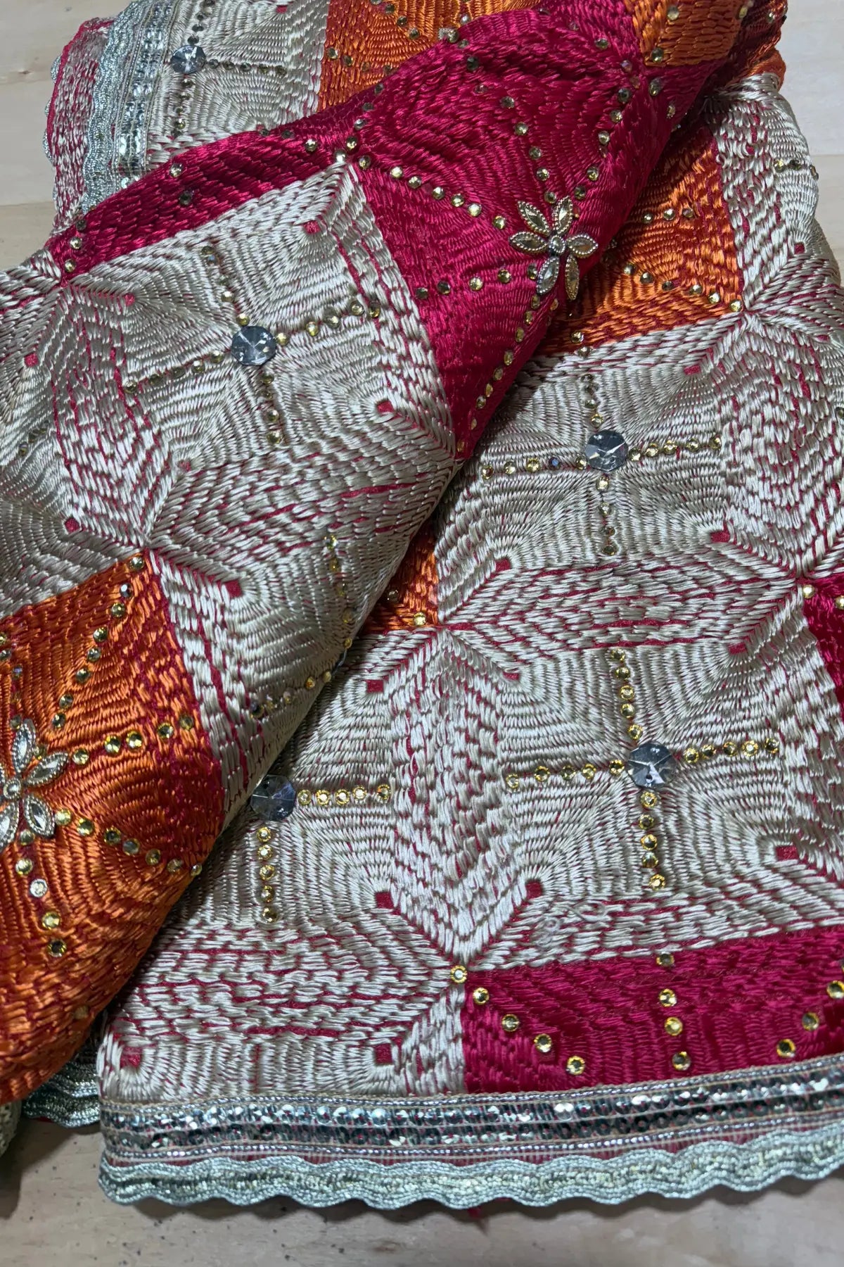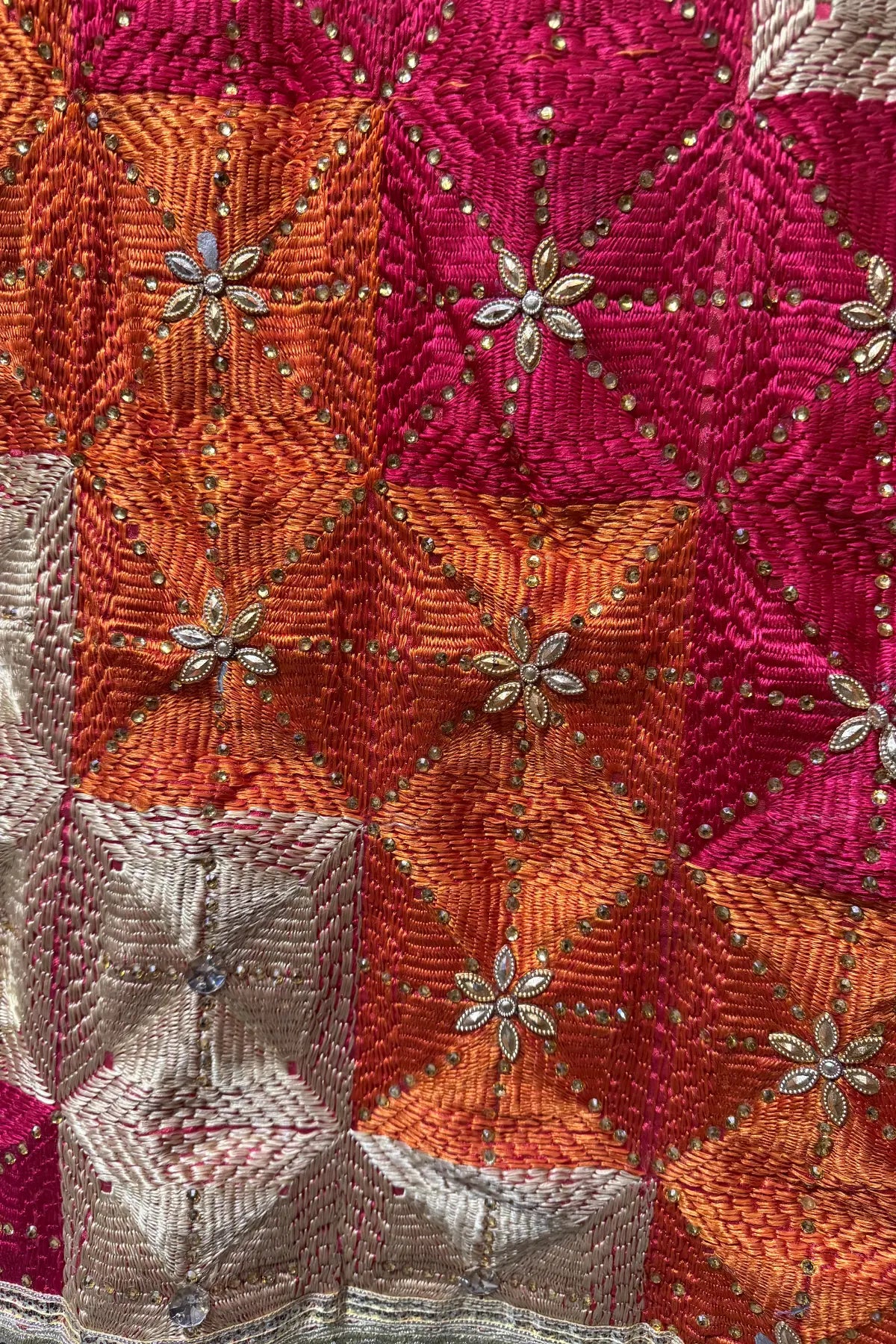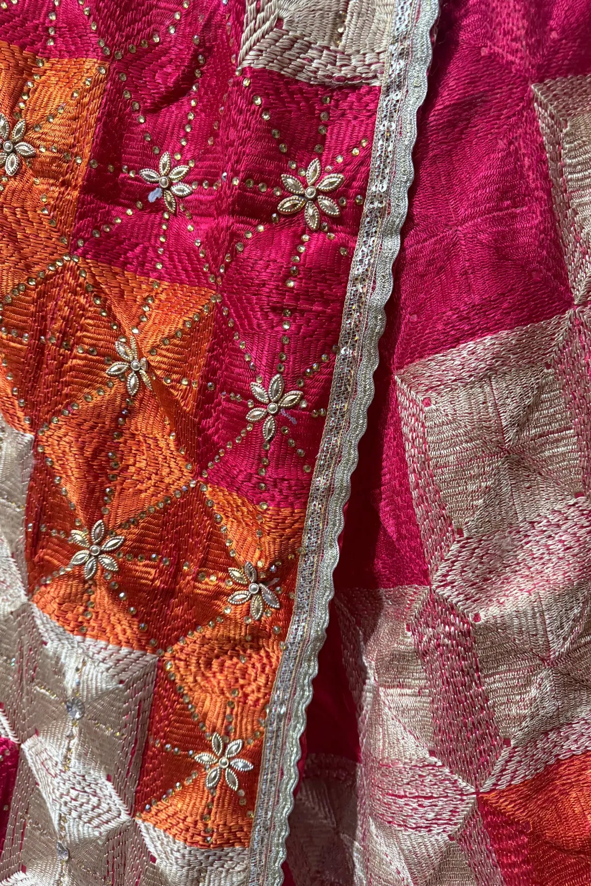 Detailed texture of premium Chinon silk fabric adorned with traditional Phulkari motifs and sequins.