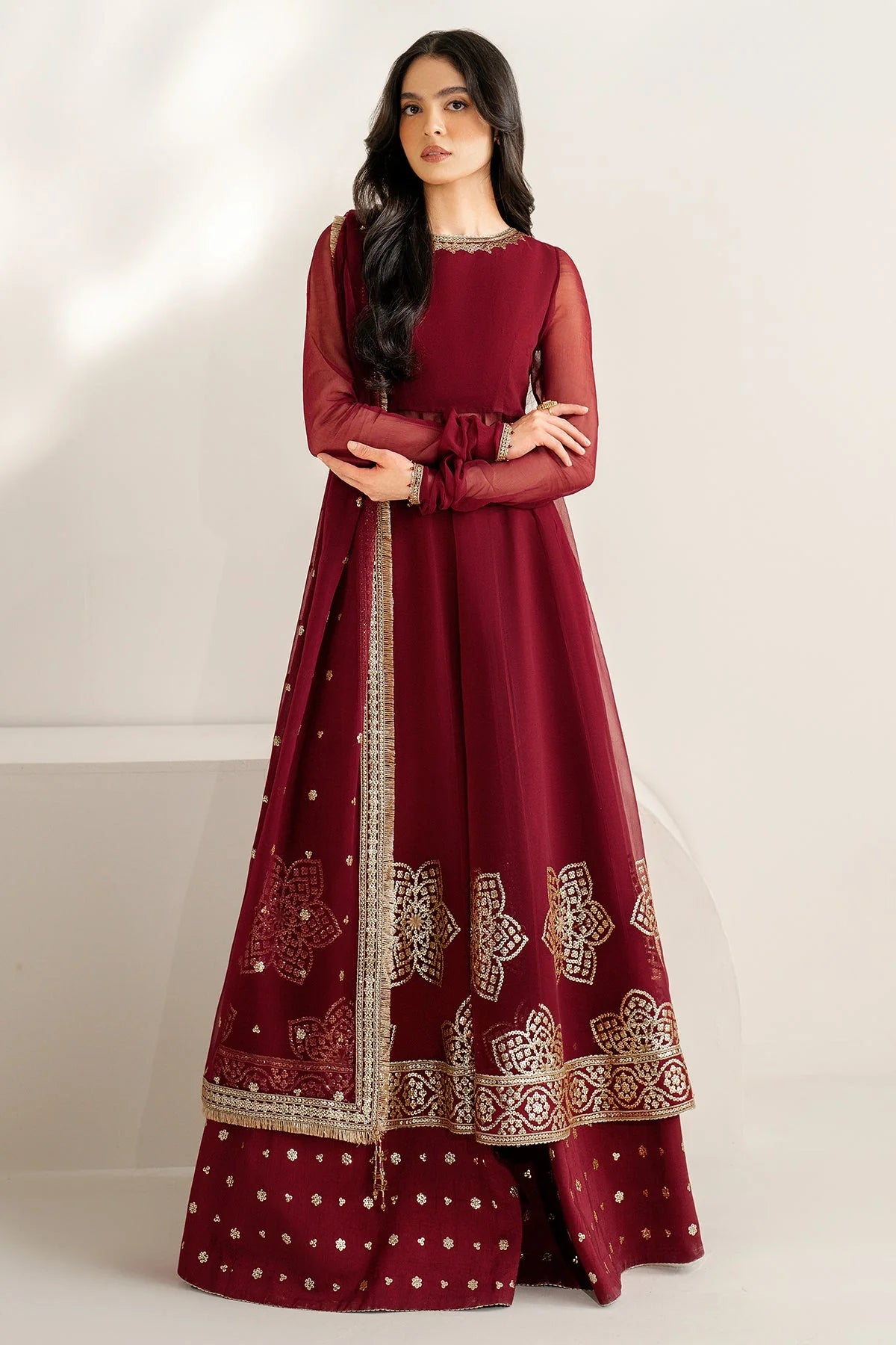 Woman wearing a long maroon anarkali dress with gold embroidery on a white background
