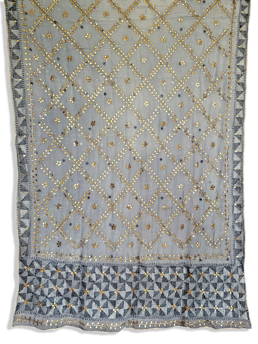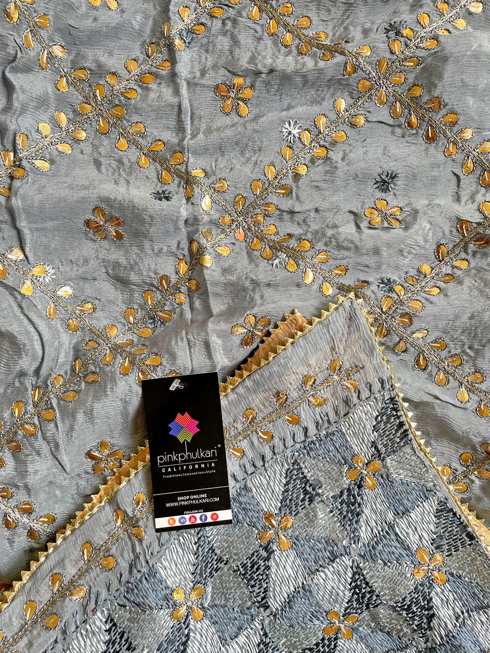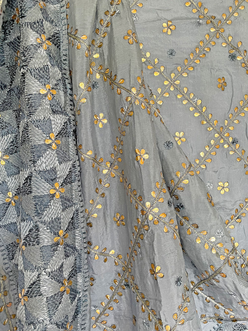 This traditional gray pure silk phulkari gotta patti work dupatta is meticulously crafted with luxurious pure Chinon silk, featuring all over gold Gotta Patti hand embroidery and boasts a striking metallic gold trim along the border.