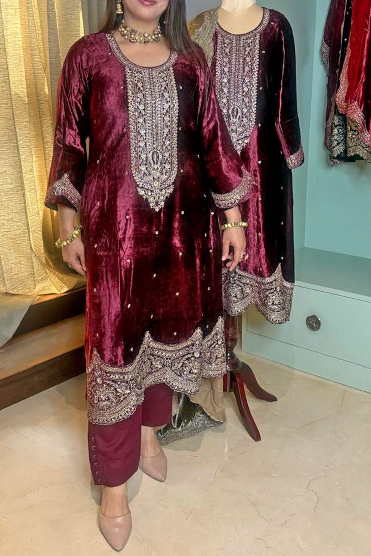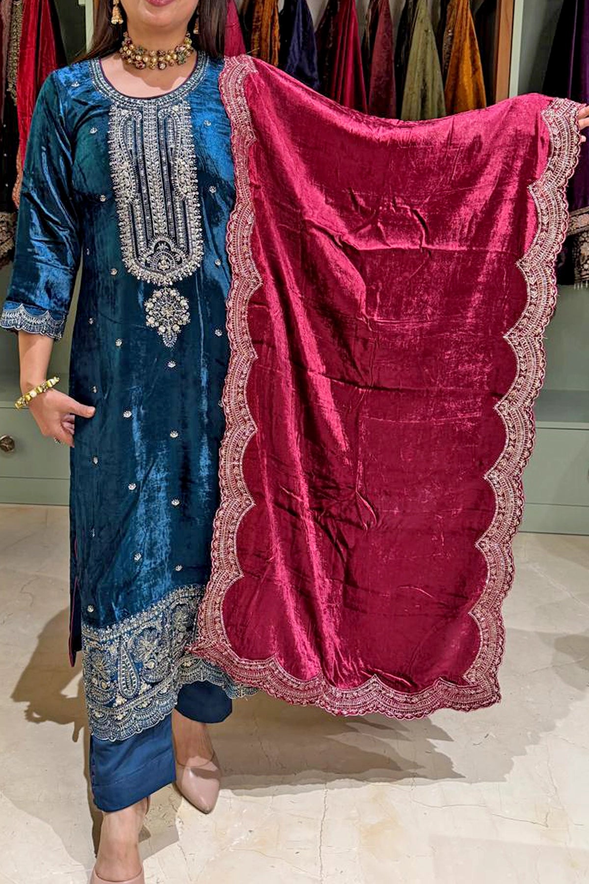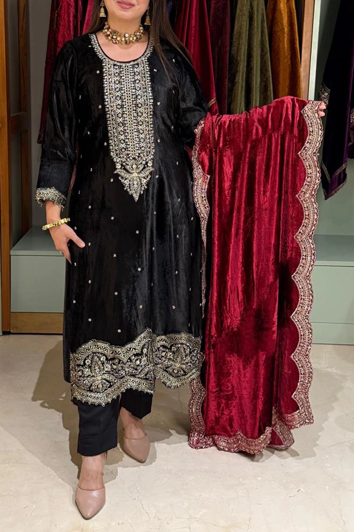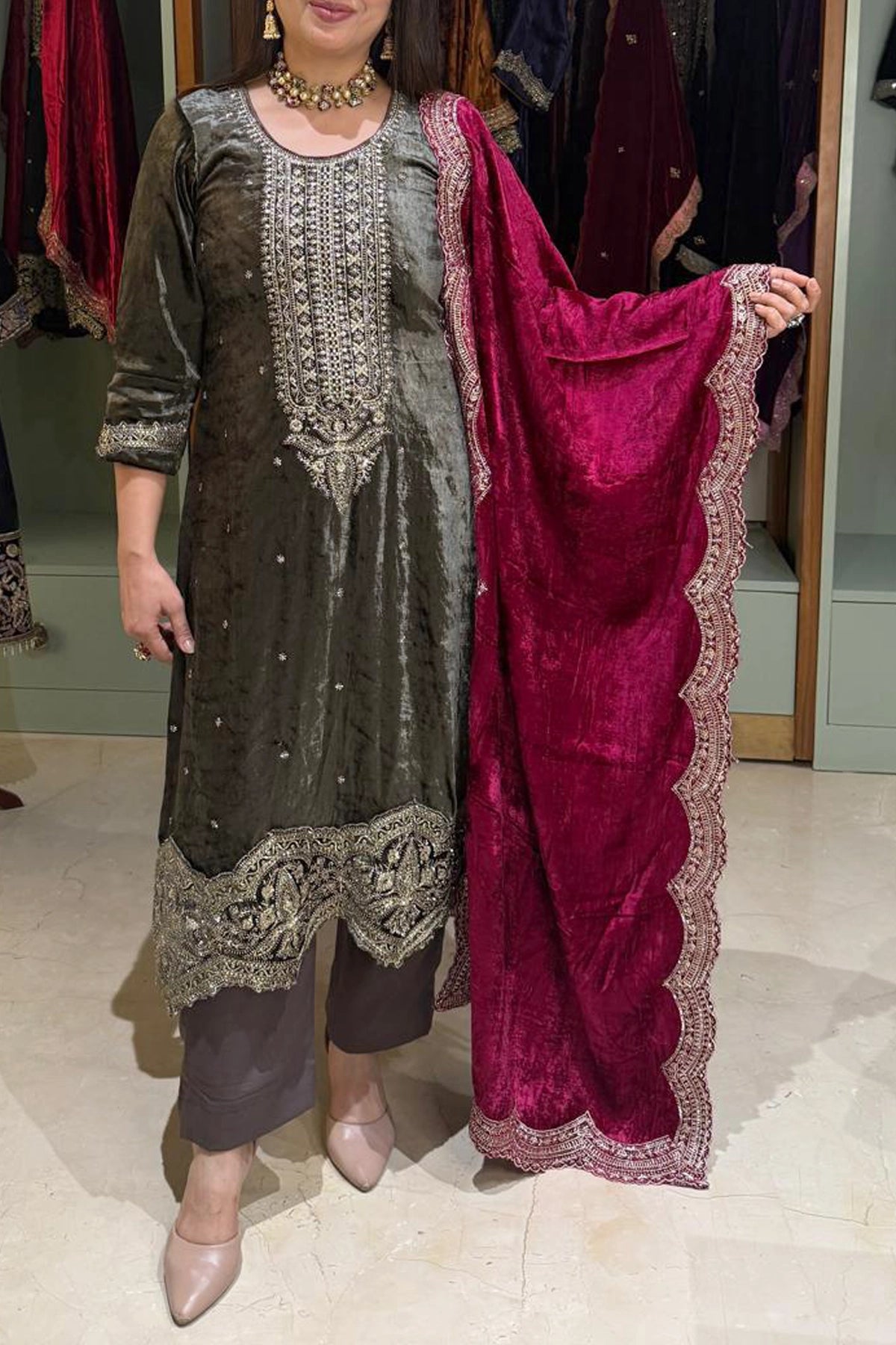 Discover the elegance of our Exclusive Boutique Velvet Zari Embroidered Kurta Set — a perfect choice for formal occasions.
