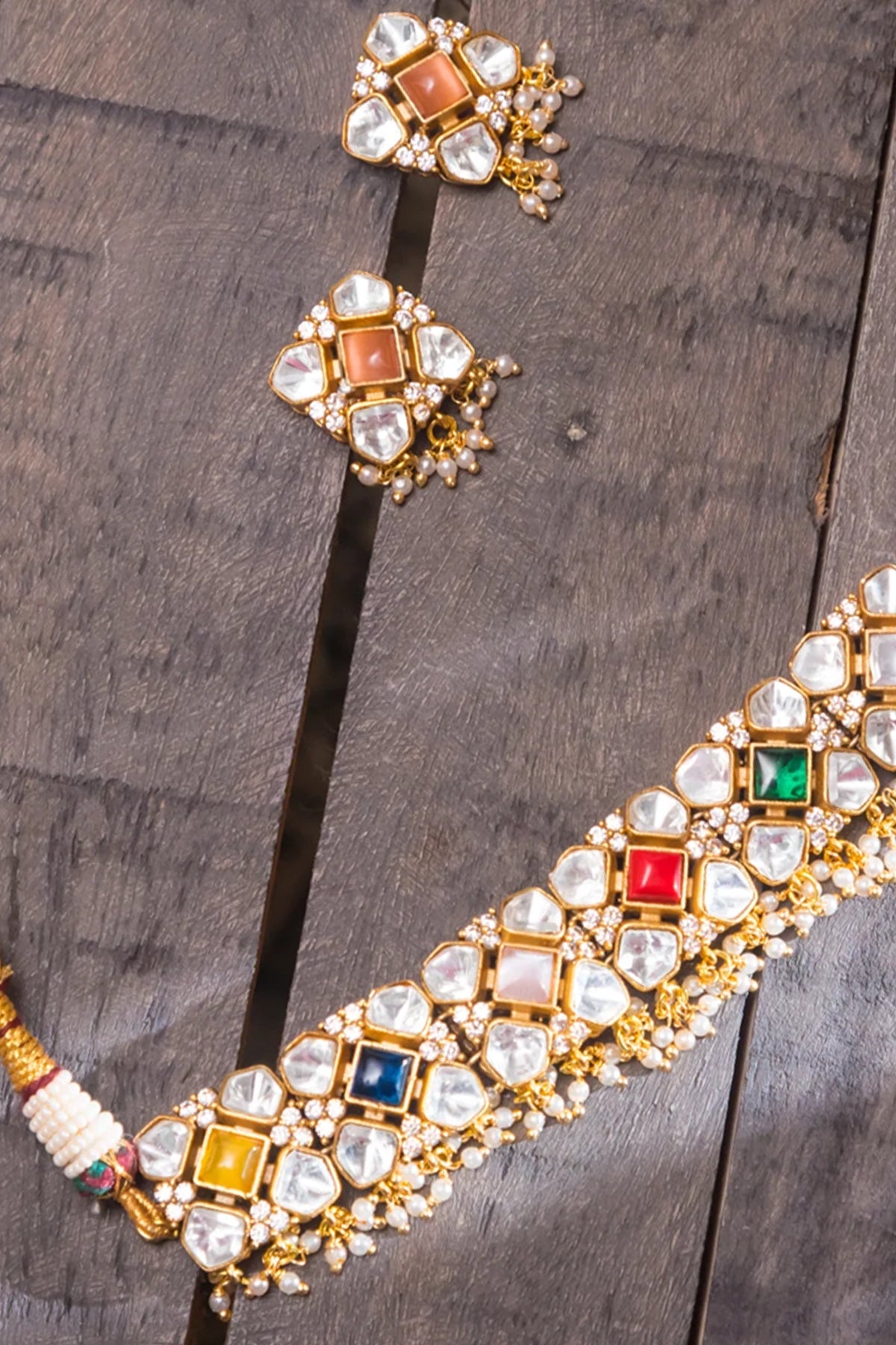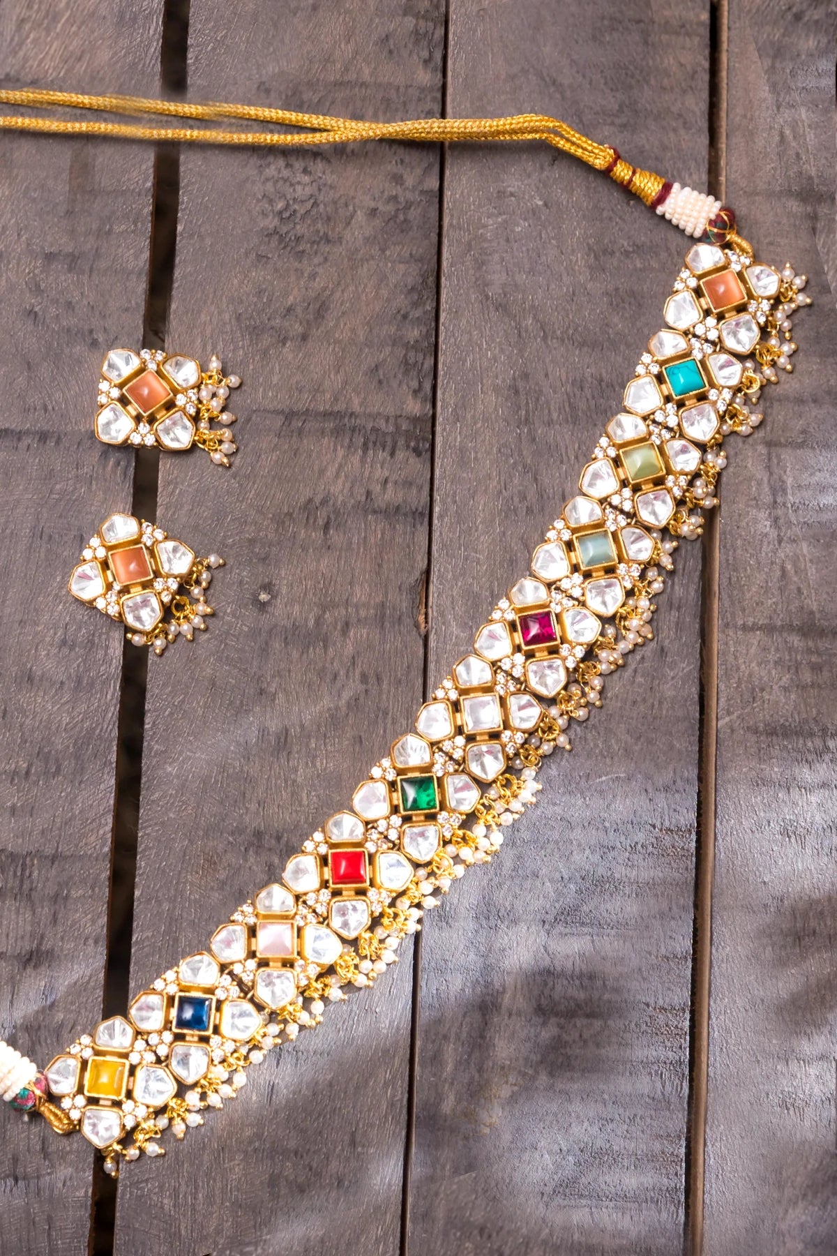Featuring a elegant navratan kundan choker studded with navratan multi kundan stones, set in mixed metal with gold plating. It is paired with a matching pair of studs.